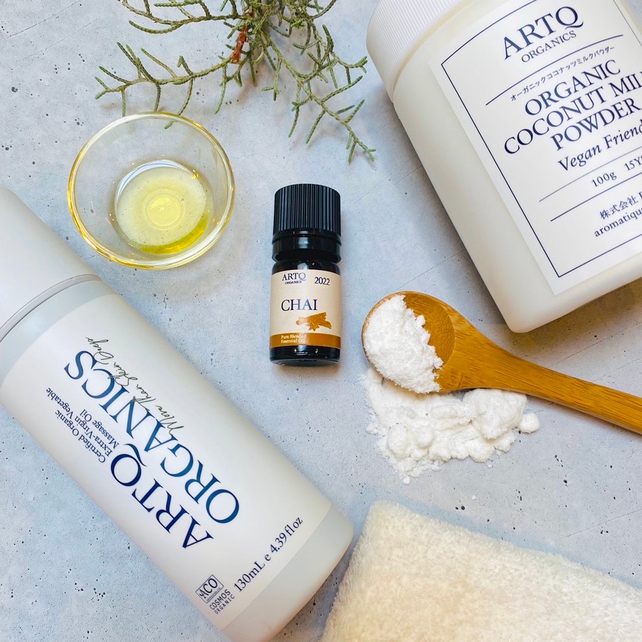 「CHAIチャイブレンド」は、バスルームでの活用で、心と身体をときほぐすような、ゆったりとした呼吸でリラックスへと導いてくれます。ココナッツミルクパウダーと一緒に美味しい香りと湯上りのしっとり肌を感じていただけるバスタイムをご堪能ください。