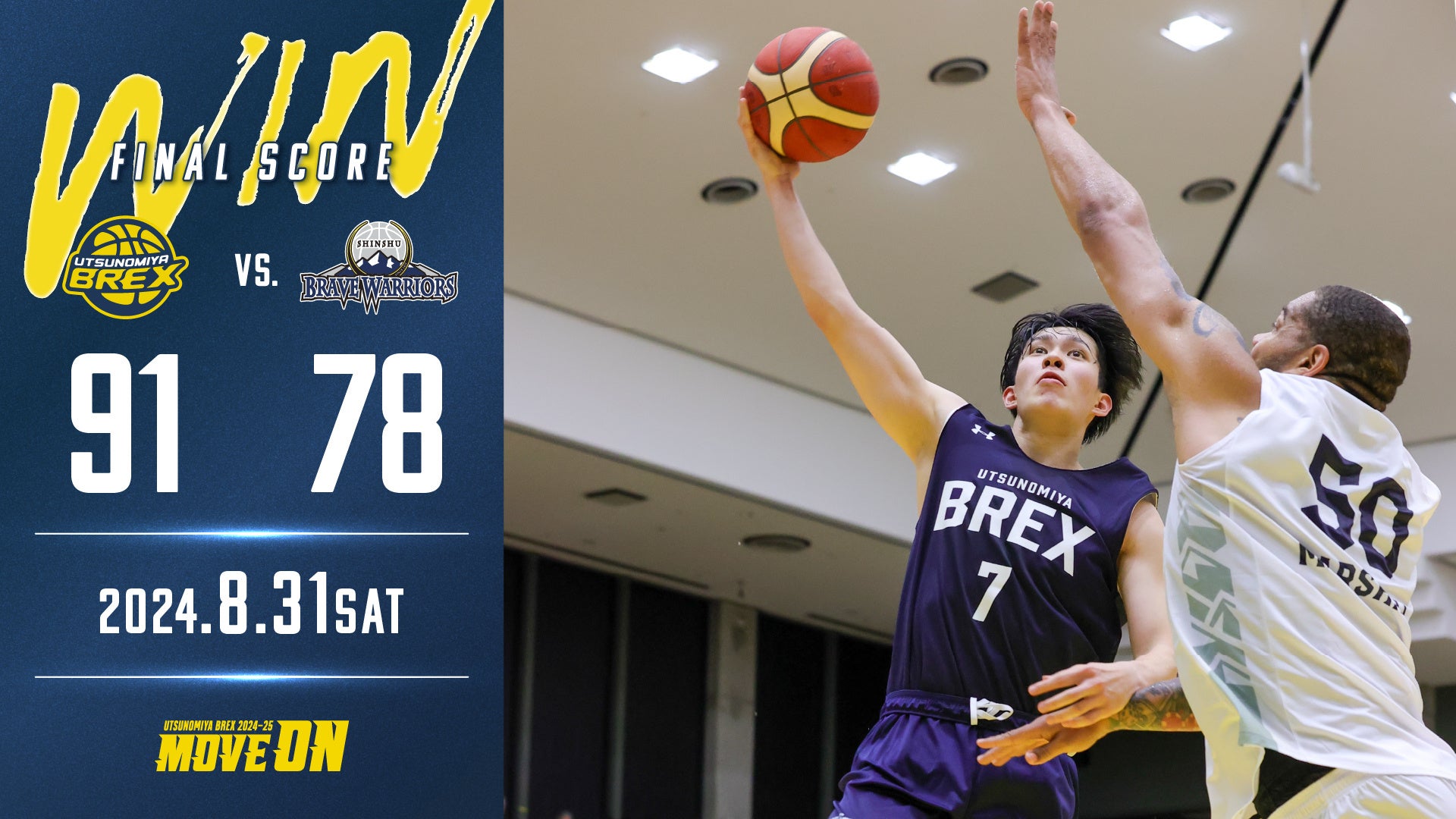 8月31日(土)は、信州ブレイブウォリアーズ(B2)と対戦。スターティング5に名を連ねた期待の22歳 #7 小川選手が24分の出場時間を得て、7得点3アシスト5リバウンドと躍動するなどし、91 - 78で勝利。