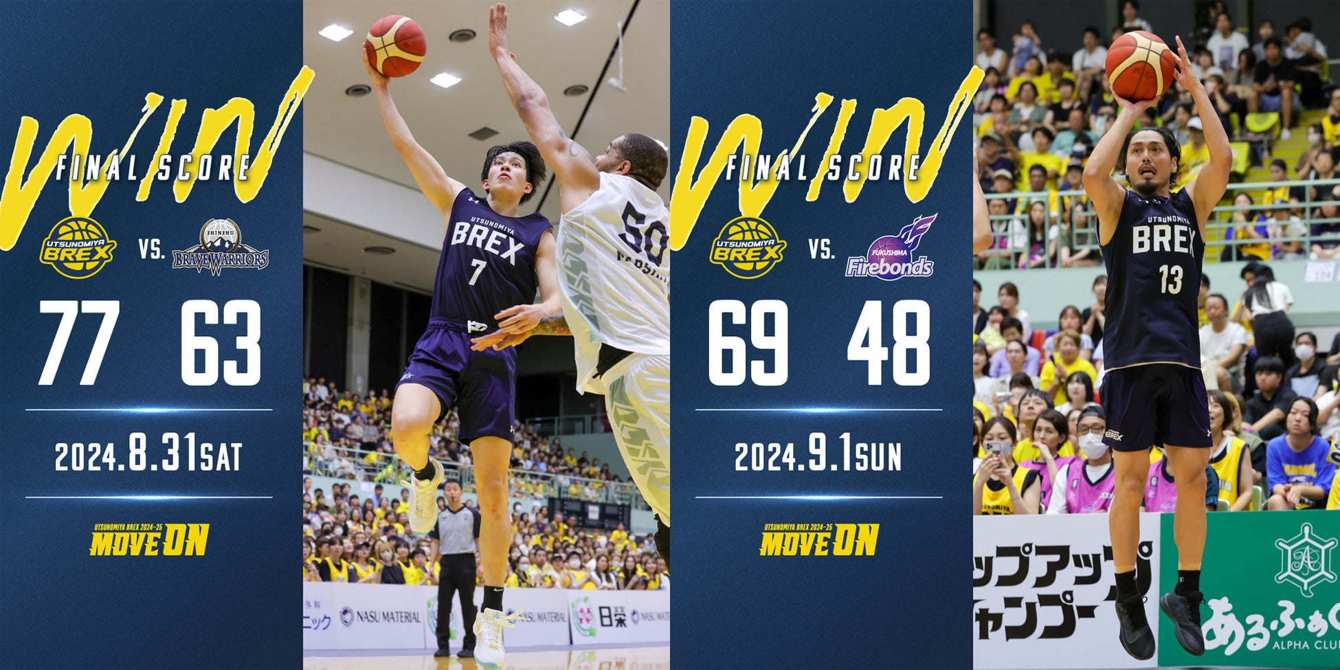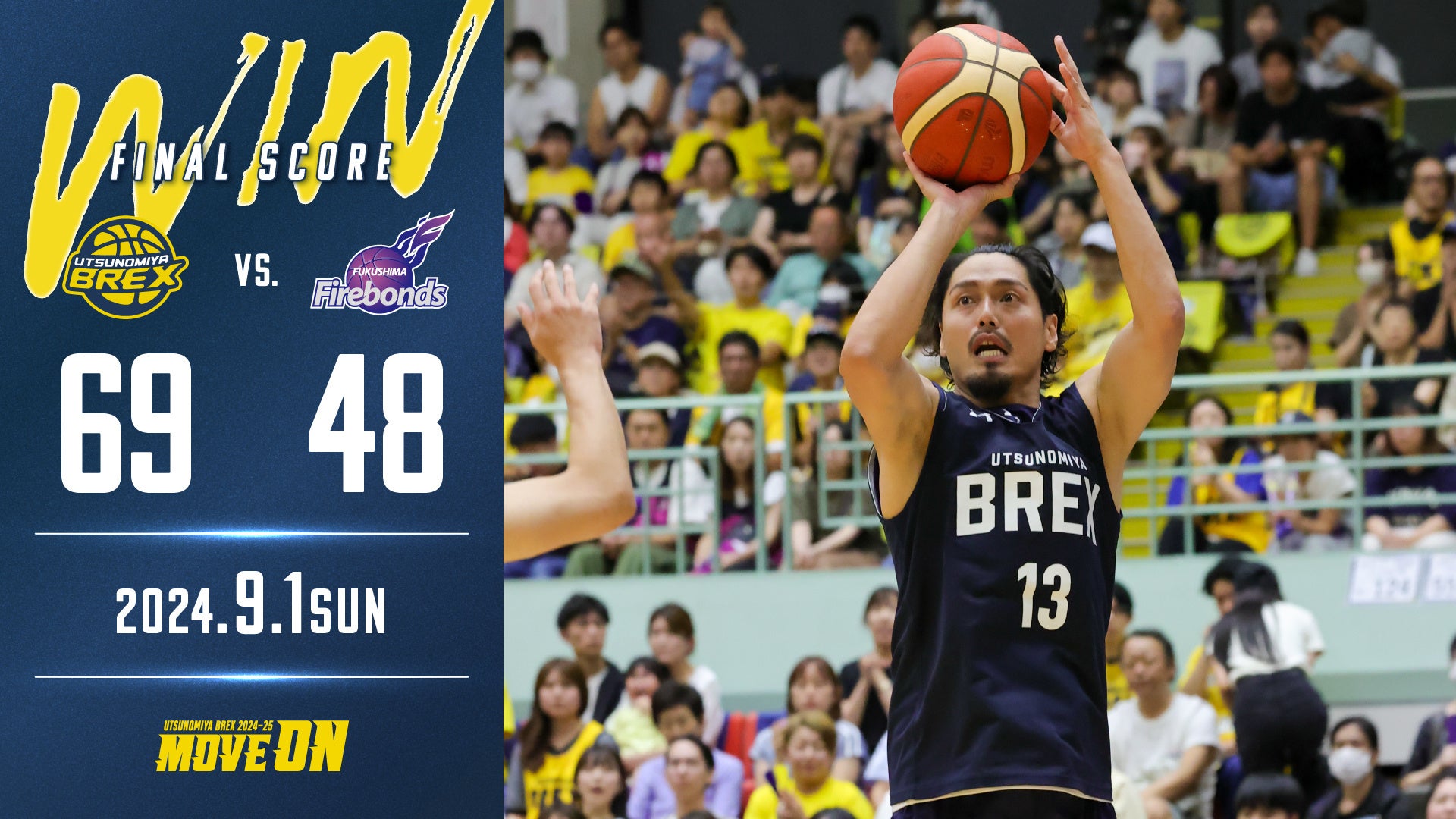 9月1日(日)は、福島ファイヤーボンズ(B2)と対戦。#12 高島選手が12得点、#13 渡邉選手が3Qに3本連続で3Pシュートを決めるなどの活躍もあり、69 - 48で勝利。