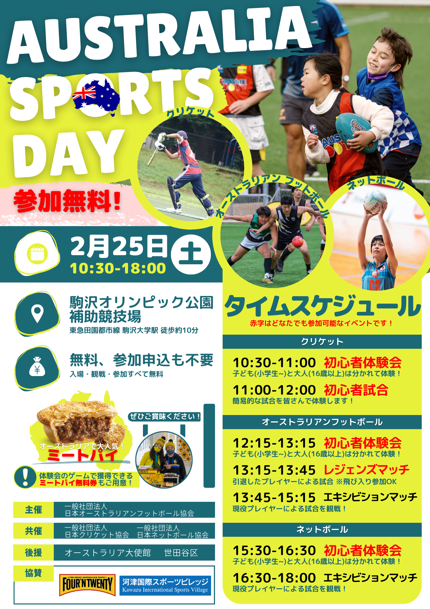 一般社団法人日本オーストラリアンフットボール協会(以下、AFL JAPAN)は1月25日(水)、Australia Sports Dayを駒沢オリンピック公園で開催することを発表しました。Australia Sports Dayはオーストラリアの大人気スポーツ3種目を一度に楽しめる無料イベントです。