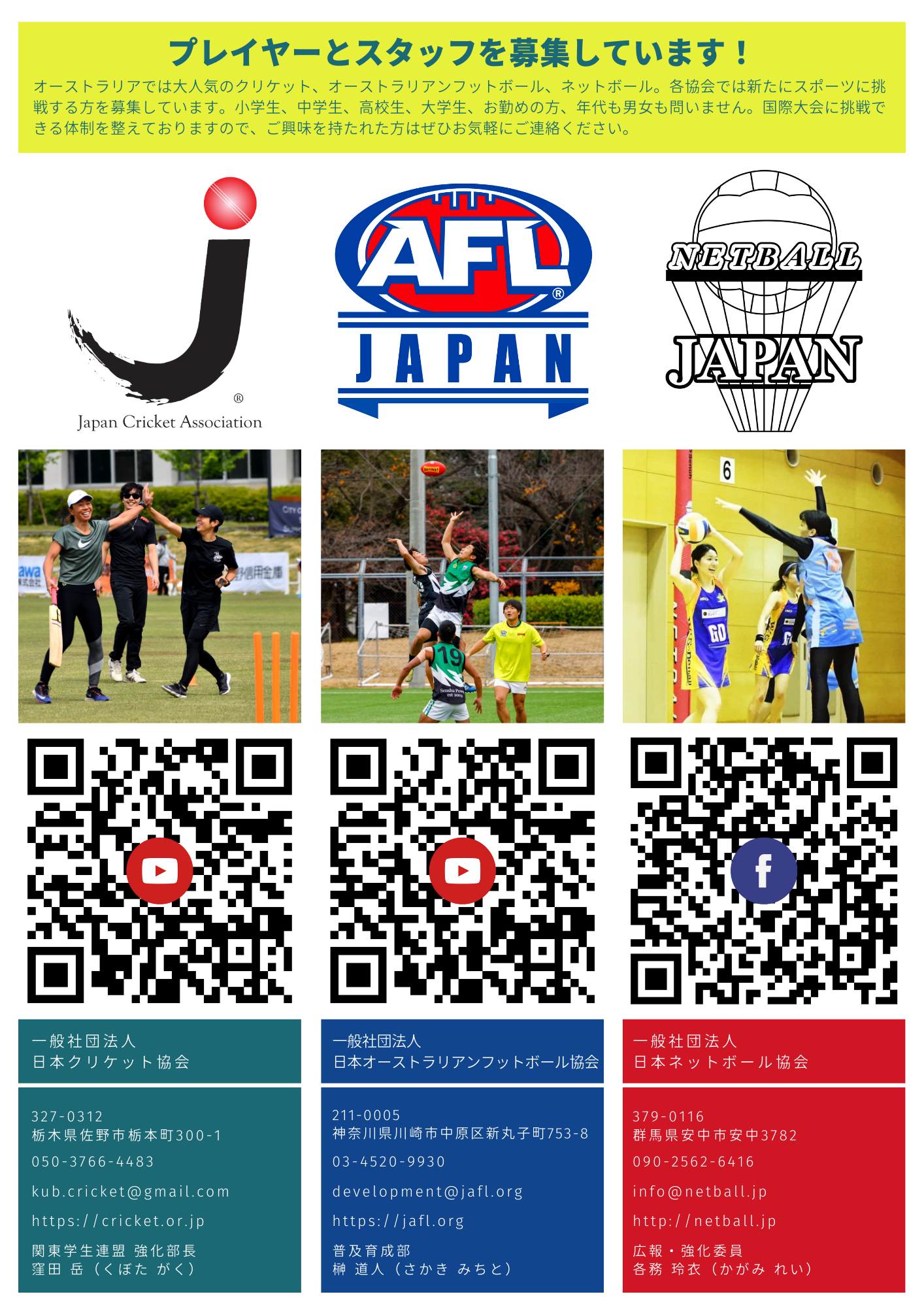 オーストラリアの大人気スポーツ3種類の体験や観戦を気軽に楽しめる本イベントに是非お越しください。