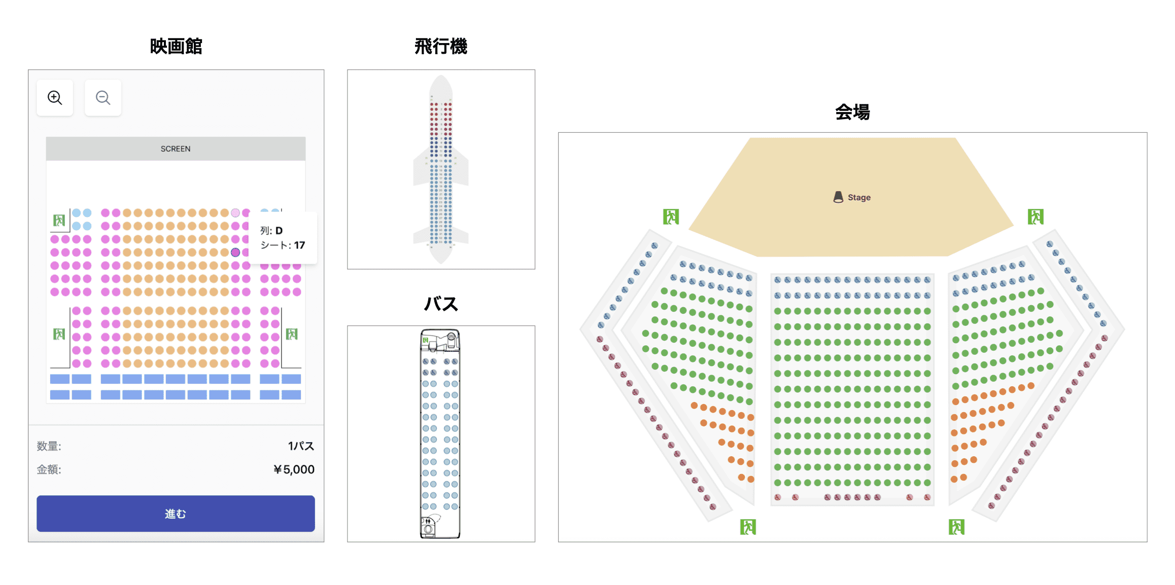 KINCHAKUのチケット発行・着券機能を利用する事業者は、個々の会場や乗り物に応じたシートマップに加え、各ゾーンや座席に割り当てる様々な券種を作成することができます。グランピング施設、ツアーバス、劇場、ライブハウス、学校のイベント、結婚式、大規模な施設など、事業者が簡単にイベントサイトを作成・管理し、収益化につなげることができます。また、テーブル席、列席、自由席のあるゾーン、VIP指定席、あるいはこれらを組み合わせることで、あらゆる配置に対応したシートマップの使用が可能です。チケットを購入する顧客は、予約状況を一目で把握できるほか、座席ごとの価格を確認し、座席のクリックでチケットを選択して購入することができます。