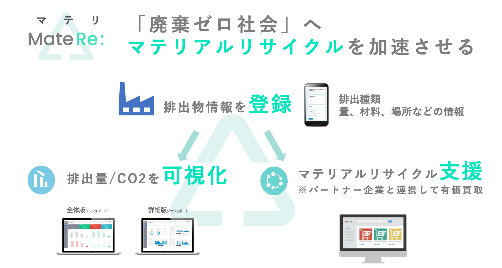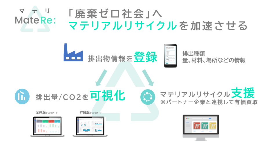 今回、「MateRe:」(マテリ)のベータ版として、事業活動に伴う排出データ(廃棄マニフェスト情報、日々の排出・廃棄情報等)の入力および排出内容(有価買取情報含む)とCO2量の算定結果のレポート機能の提供を開始しました。