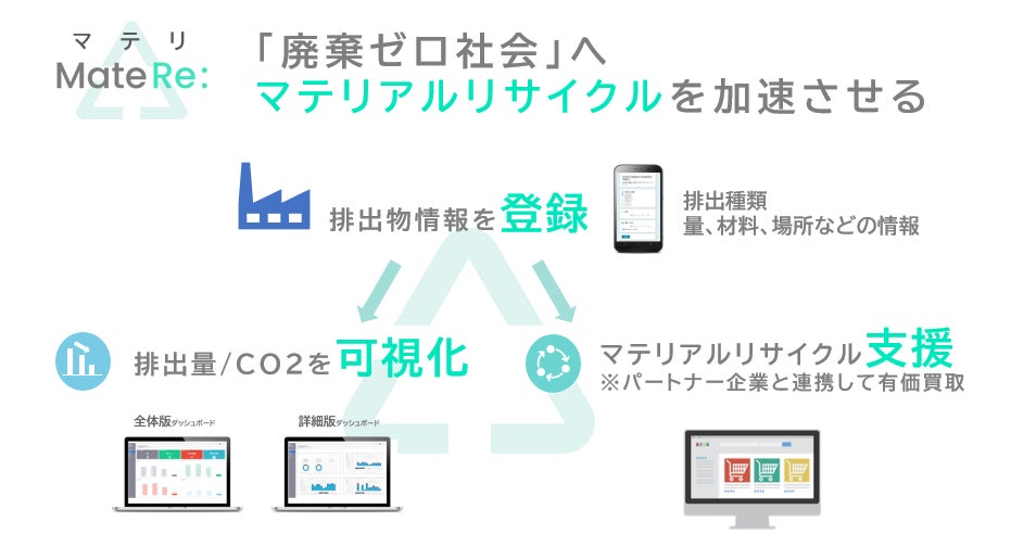 また、今後「MateRe:」(マテリ)は、排出される資源(素材、マテリアル)を再生利用可能な高付加価値材としてリサイクルすべく、排出事業者とリサイクラーのマッチングによる排出物の売却支援機能の提供を予定しています。