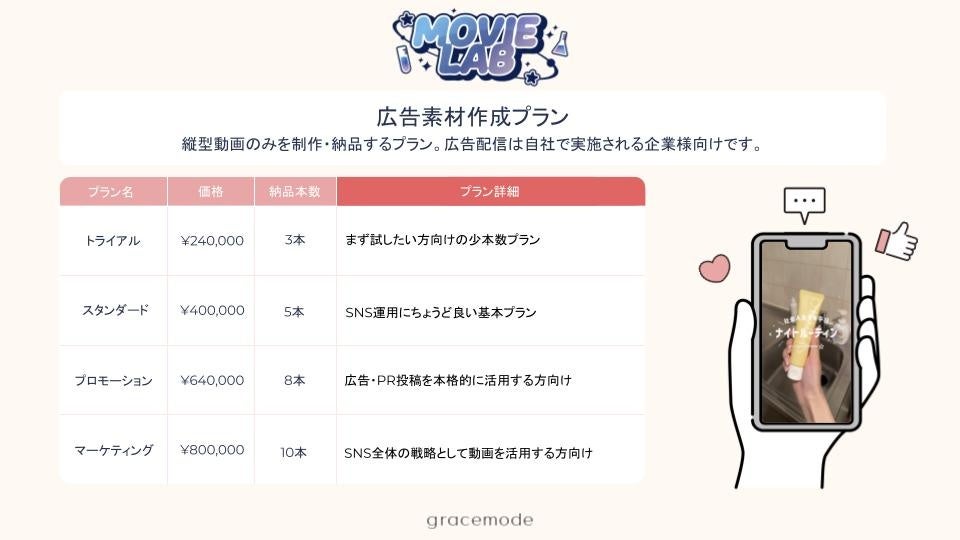 国内最大級の美容メディア「EMME」を運営するgracemodeが、SNSバズ投稿の知見を集約した縦型動画制作サービス「MOVIE LAB(ムービーラボ)」を提供開始