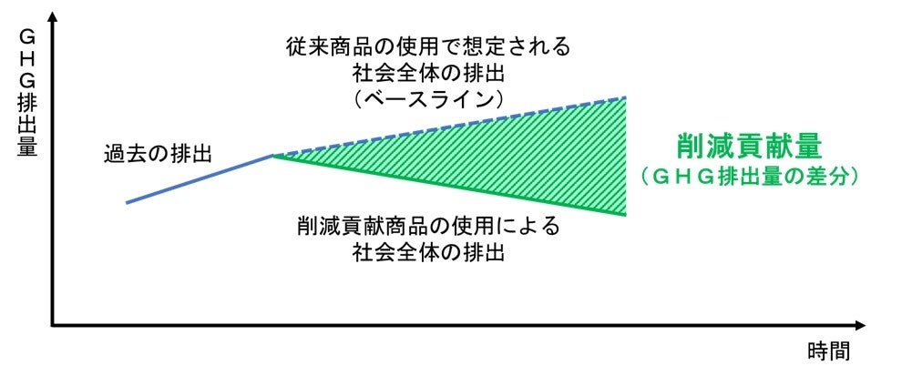 ※1 削減貢献商品の発揮するGHG削減効果(削減貢献量)とは、従来の製品・サービス(ベースライン)と新たな製品・サービスのGHG排出量の差分であり、製品・サービスを通じて社会全体の気候変動の緩和への貢献を定量化したもの。