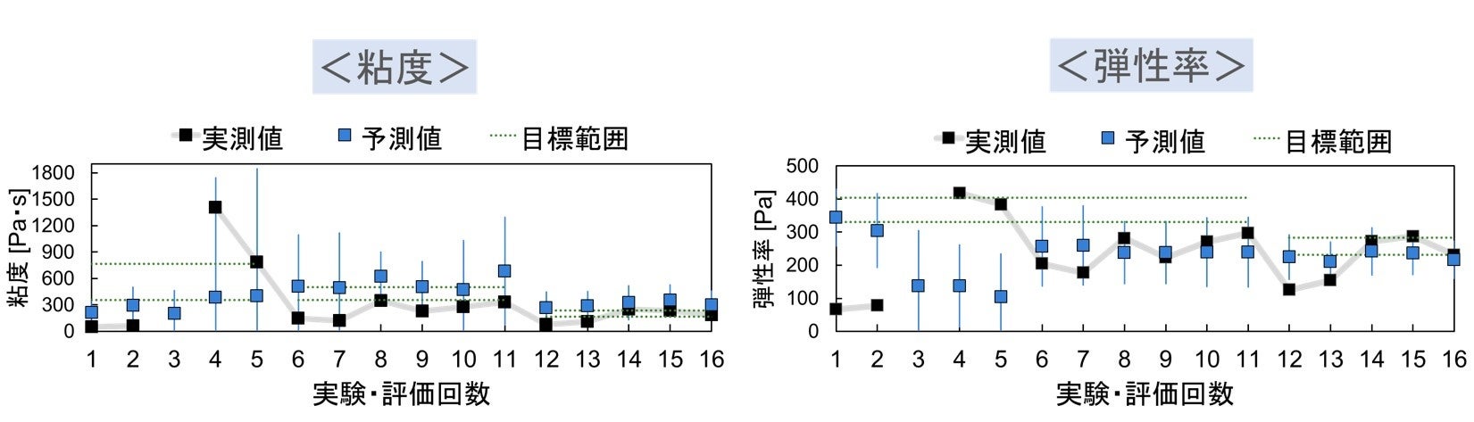 上記の実験計画手法を用いて、ハミガキの固さと滑らかさの物性指標である粘度と弾性率の最適組成を探索しました。その結果、サンプルは100回以上作製することも珍しくない中、16回の作製で目標を満たす組成を導き出すことができ(図2)、本手法に伴う追加工程を含めても想定の約半分の期間での組成開発を実現しました。