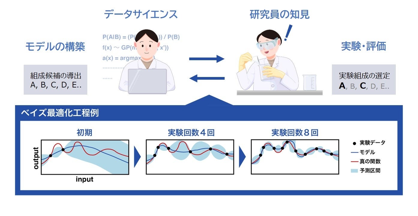 そこで本研究では、限られた既知データを起点に組成探索が可能な機械学習手法である「ベイズ最適化」に、研究員の知見を効果的に取り入れることで、より少ない実験回数で複数の目標を満たすことが出来る実験計画手法を確立しました(図1)。