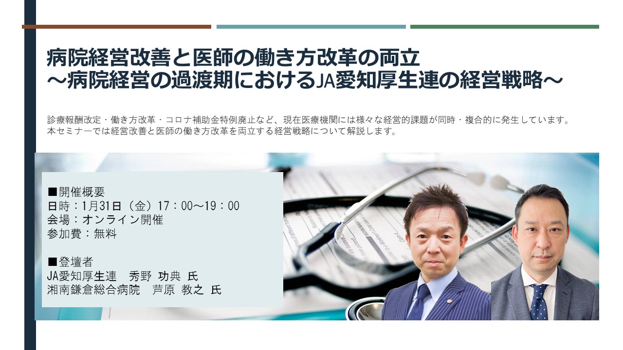 そこでこのたび、JA愛知厚生連 秀野功典 氏を招き、人的資本経営の推進や自律型人材育成の強化、医師の負担軽減と入院・手術増加による経営の担保等、「医師の働き方改革」について幅広くテーマを取り上げたオンライン講演会を開催いたします。
