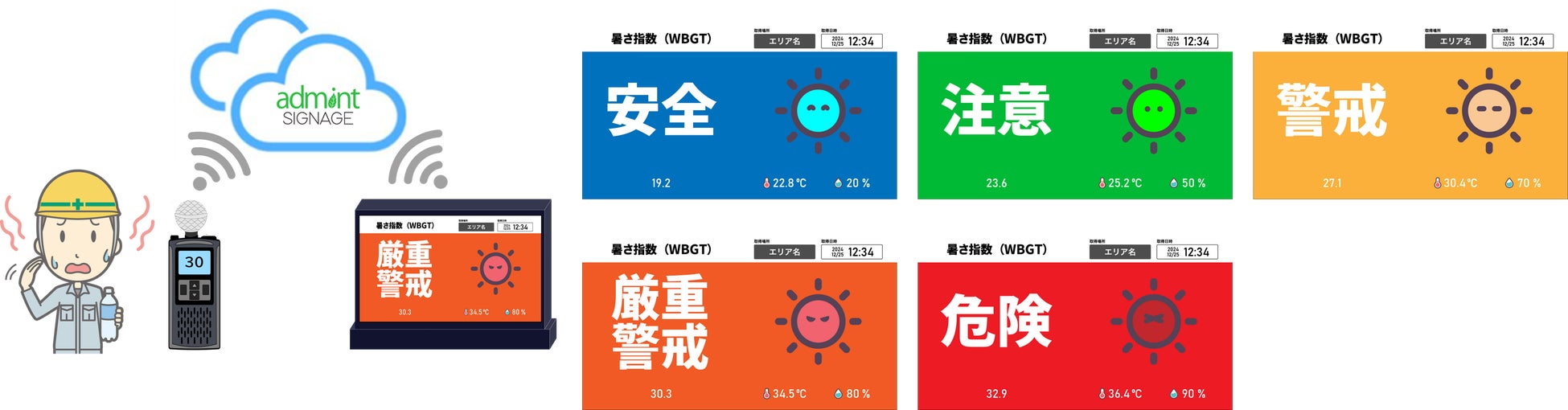 デジタルサイネージ向けクラウドサービスを提供するデジタルクルーズ株式会社(本社:東京都中央区、代表取締役:押田 賢一)は、MEテック株式会社(所在地:東京都品川区、代表取締役:武田一人)と共同開発した、作業現場ごとに設置した熱中症指数計とIoT連携できるデジタルサイネージを5月8日に発売します。工事現場向けサイネージとして多数の導入実績のあるadmintサイネージクラウド環境へ熱中症指数計のデータ取り込み、5段階で注意情報を表示、熱中症発症の注意喚起を行います。