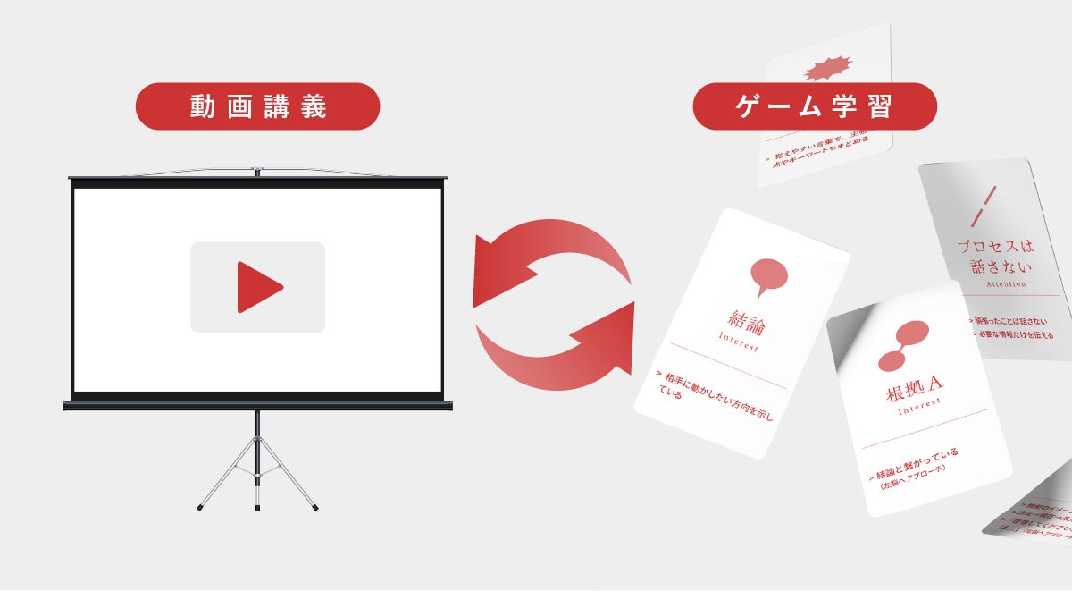 研修では、伊藤氏が自ら解説する動画講義と、『1分で話せ』をその場で実践できるビジネスゲームで、インプットとアウトプットを繰り返しながら学んでいきます。