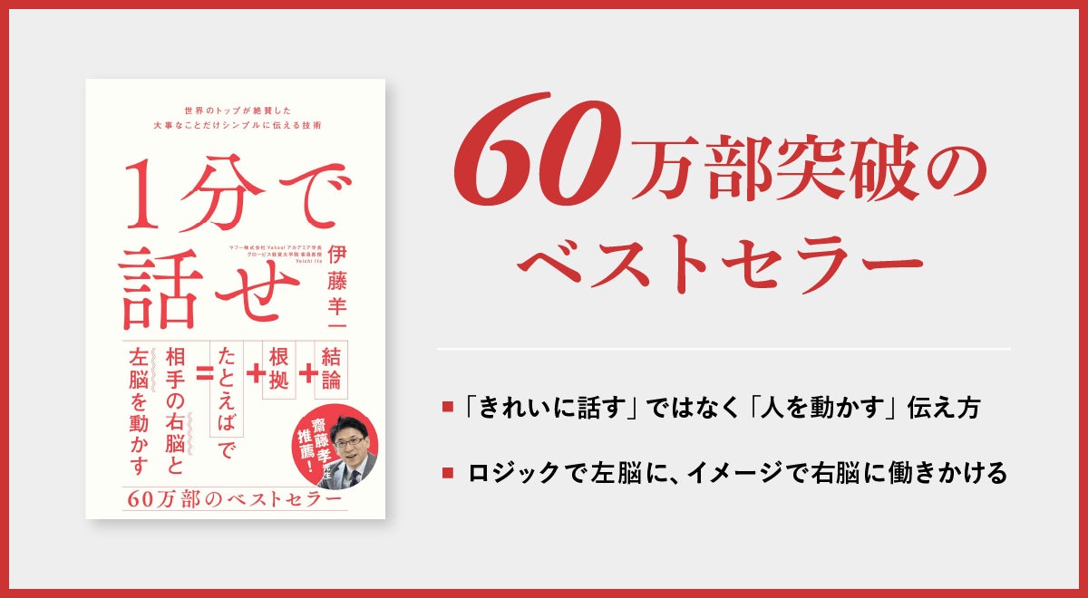 『1分で話せ』は累計発行部数60万部を超えるベストセラーで、「伝わる話し方」の型、メンタル、応用テクニックまで、誰でも実践できる伊藤氏独特のコミュニケーションメソッドが詰まっています。