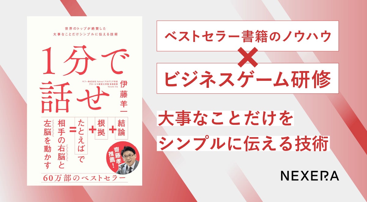 ビジネスゲーム研修を提供する株式会社NEXERAは、『1分で話せ』の著者伊藤羊一氏、ならびに発行元のSBクリエイティブ株式会社と連携し、『1分で話せ』のエッセンスを体感できるビジネスゲーム研修を開発いたします。本研修は2024年8月をめどに提供を開始いたします。