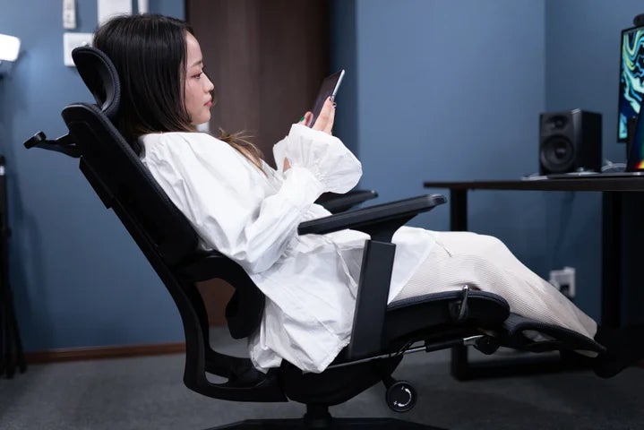 リクライニング機能も充実しており、背もたれは4段階・最大135度まで角度調整が可能です。作業の合間に深くリクライニングさせれば、まるでパーソナルシアターのようにリラックスした姿勢で映画鑑賞や読書を楽しむこともできます。適度な傾斜で仮眠をとることもできるため、在宅勤務中の休憩やオフィスでのリフレッシュにも最適です。