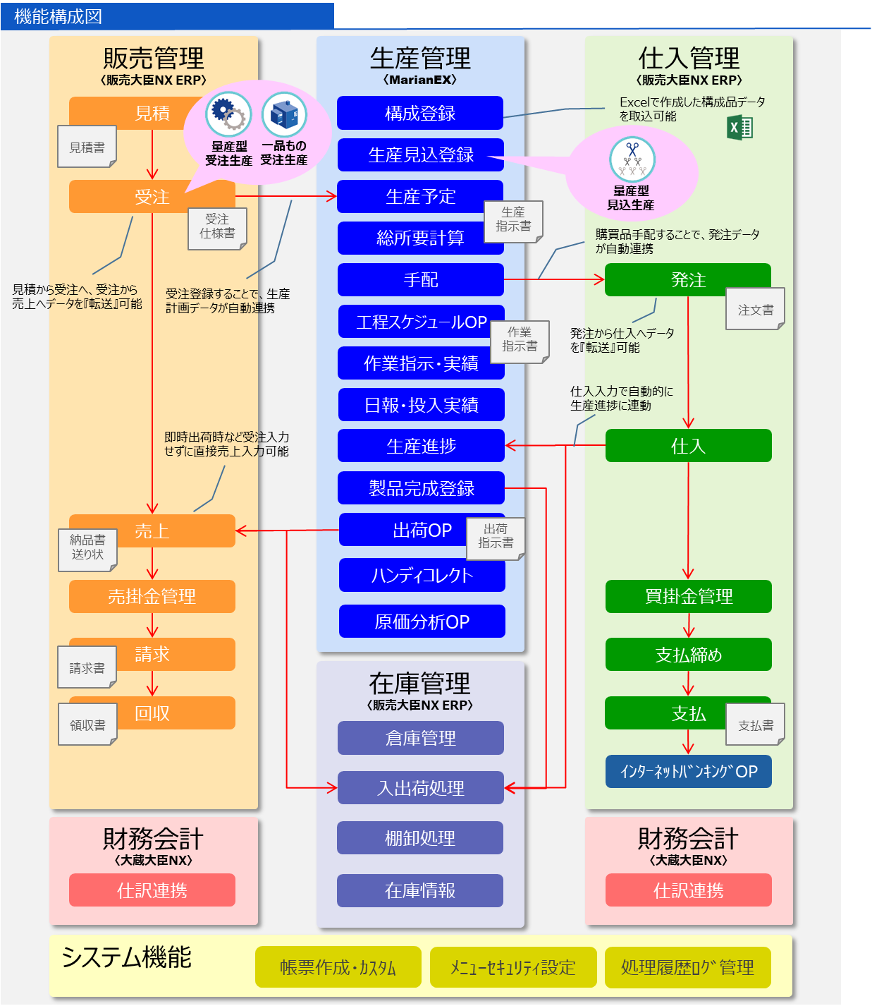Marian EXは、販売大臣NX ERPと連携する、マーズコンピュータ株式会社提供の生産ソリューションです。生産活動に必要な機能だけをパッケージ化し、ERP(統合基幹業務システム)連動にてマスタ・在庫の共通化、リアルタイムな受発注連携、発注・仕入連携、製造完成連携が可能。販売大臣NX ERPとのシームレスな連携で、ワンストップでの販売管理業務と生産管理業務を実現します。