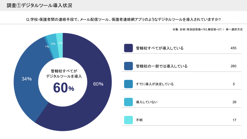 通知発出から1年以上が経過し、弊社では公立小中学校における保護者連絡用デジタルツール導入の実態と課題調査を目的として、地方自治体の教育委員会および教育関連部署へのアンケートを行いました。