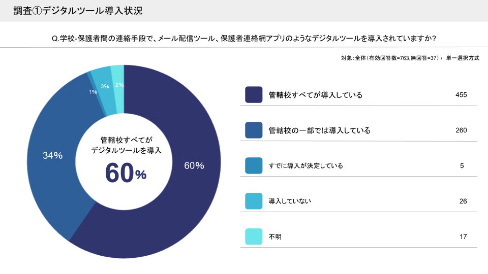 全国の学校向けに教育プラットフォームを提供するClassi株式会社(本社:東京都新宿区、代表取締役社長:加藤 理啓、以下Classi)は、地方自治体の教育委員会および教育関連部署 800団体を対象に、公立小中学校における保護者連絡用デジタルツール(メール配信ツール、保護者連絡網アプリ等)の導入状況について調査を実施しました。