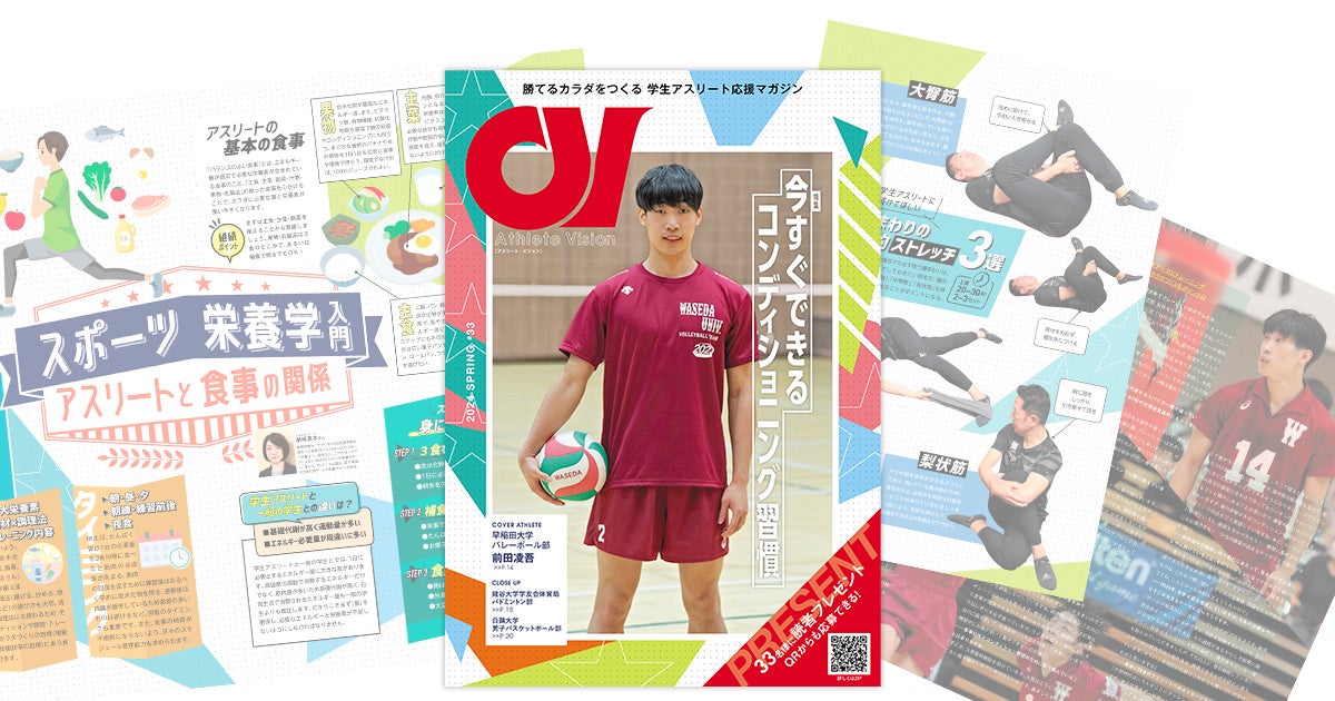 『アスリート・ビジョン』は、全国の学生アスリート(※)を対象に配布しているフリーマガジンです。「勝てるカラダをつくる」をコンセプトに競技力向上に必要な【カラダづくり】に役立つ情報を発信しています。栄養士、トレーナーなどの専門家の監修のもと、栄養・食事のとり方やトレーニング方法、メンタル、ボディケアなど、スポーツ現場で長く活用できる知識を分かりやすく解説しています。