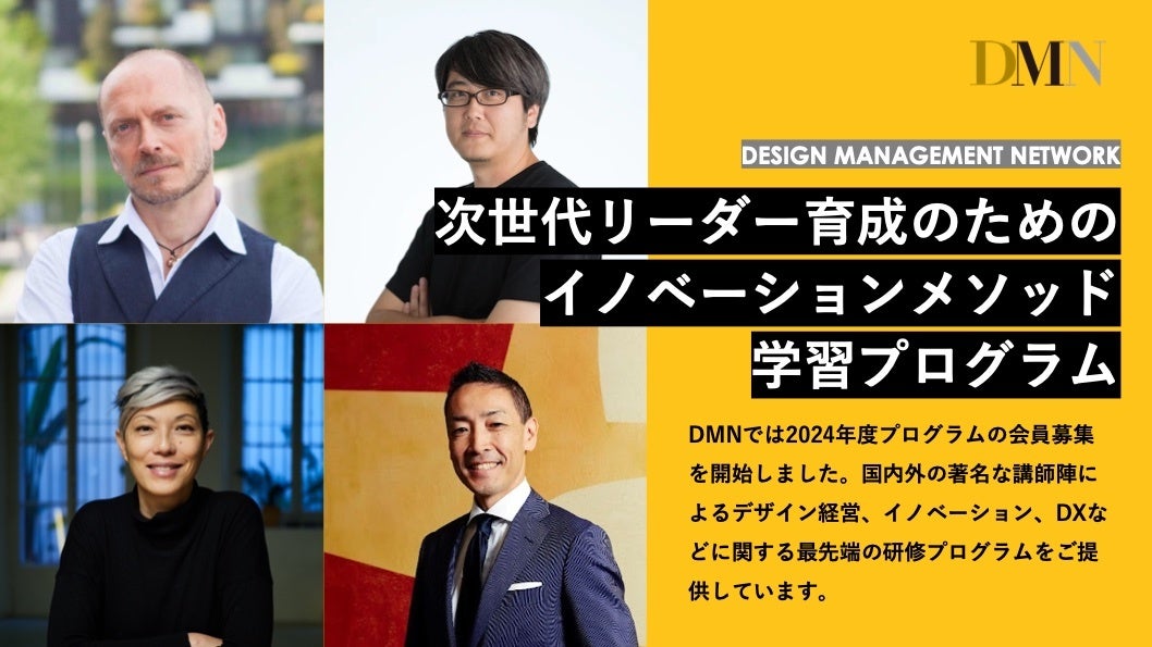 DMNは1990 年にダイヤモンド社によって設立され、デザインを通じて企業の持続的な成長を支援するネットワークです。世界の先進的なヴィジョンやメソッドの発信と人材育成プログラムをご提供してまいりました。デザイン経営、イノベーション等の最先端の知識やノウハウを第一線で活躍する講師から学べると同時に、現場で使えるメソッドを持ち帰っていただける点が特徴です。最先端のプログラムを多数ご用意しておりますが、その中でも特に「注目のプログラム」として3名の講師をご紹介します。