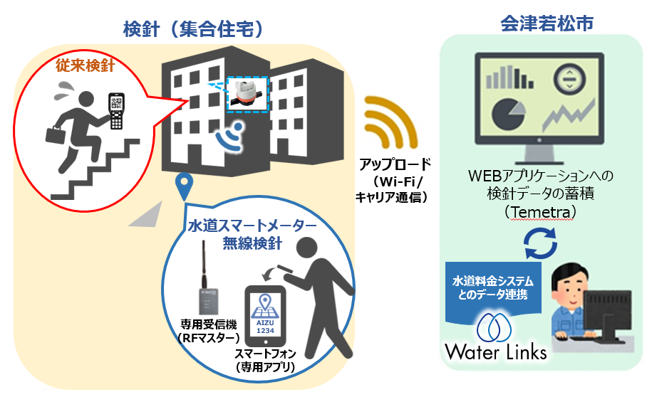会津若松市は「スマートシティ会津若松」を掲げ、幅広い分野においてデジタル技術などの最新技術を活用したまちづくりを進めています。※3ウォーターリンクスは、水道スマートメーターは水道分野におけるスマートシティ実現の一つの重要なツールになると考え、本研究の提案を行いました。水道スマートメーターは、デジタル技術を用いた無線検針により、従来の目視検針より効率化、省人化が可能なうえ、取得した検針値、およびその他データの利活用による従来の住民サービスの質の向上や、新しいサービスの創出など、今後、幅広い活用方法が期待されるツールとなります。
