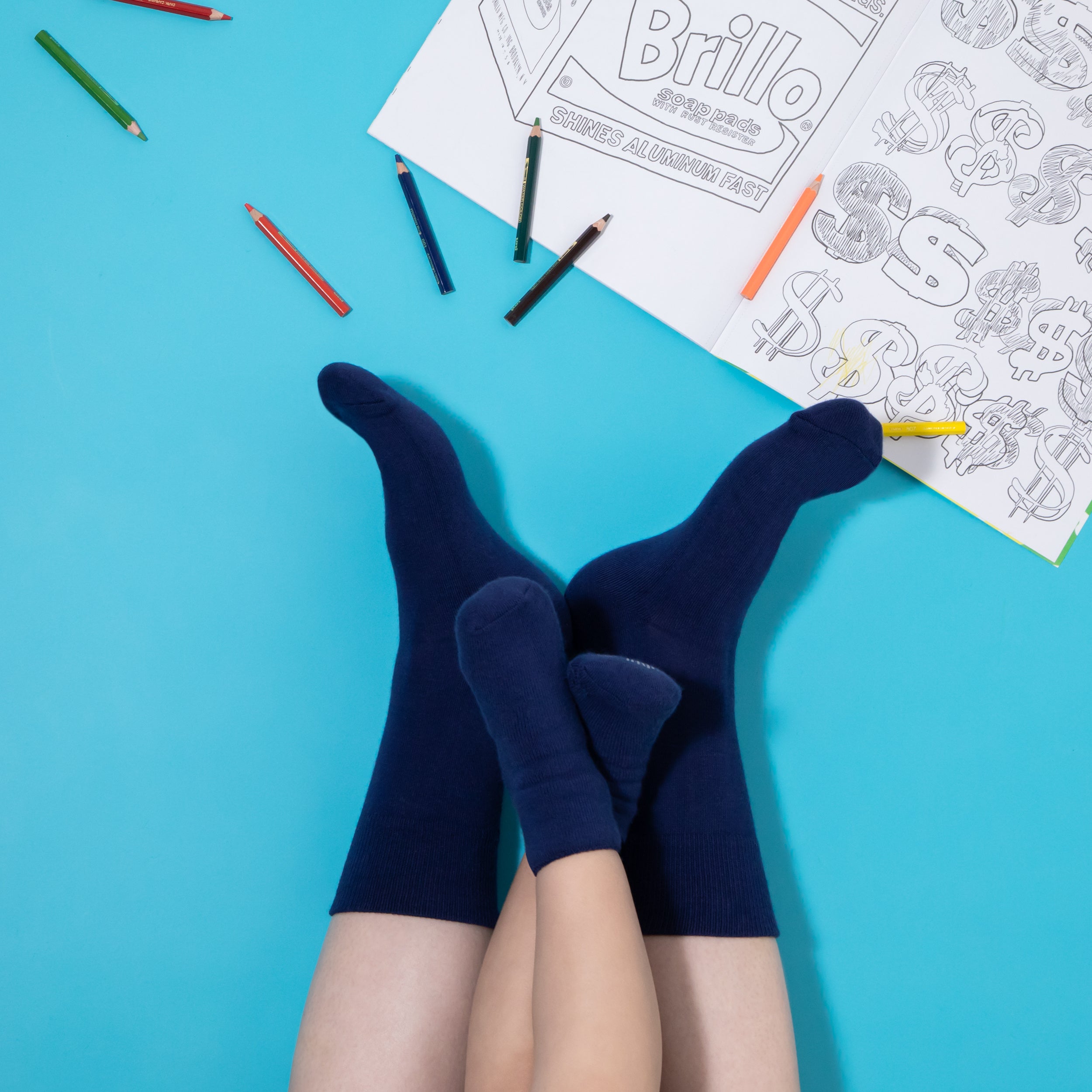 圧を分散させる幅広のリブ、「糸・編み・仕上げ」と全ての工程でこだわった、ストレッチ性。足をやさしくつつむパイル生地。通常の靴下の約1.6倍の長さの糸を細かい密度で編むことでふわっとし、足にストレスを与えない最上級の履き心地を目指しました。ベビーは「内側が全パイル、リブ無し」仕様。ゆっくり丁寧に編み立てる、稀少な旧式編み機で製造しデリケートな赤ちゃんの肌を守るため一足いっそく、ていねいにつくりました。