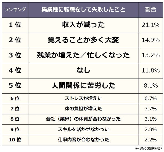 転職してよかったことで4位だった収入増ですが、転職して失敗したことでは、「収入が減った」が1位に。