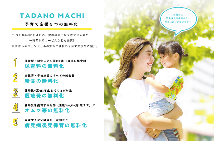 「ただのまち加西」として展開している「子育て応援5つの無料化」をはじめとし