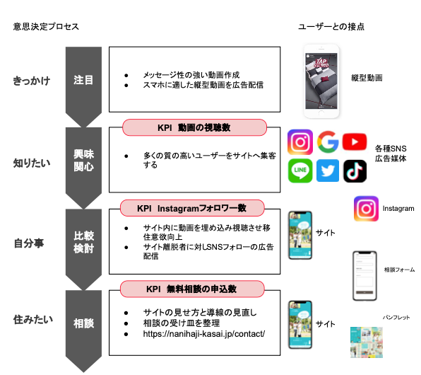 下図のように、まずは加西市を知るきっかけを作る過程(認知)から、興味関心を持ってもらい、実際に自分事として他の市町村と比較検討した上で、実際に住みたいと相談をいただくまでの一連のプレセスをwebマーケティングの知見を生かして一気通貫で当社がPRを行います。その際に、弊社がこれまで培ってきたHP、各SNS、その他web広告に関する総合的なマーケティングにより、人口増政策の推進に協力いたします。