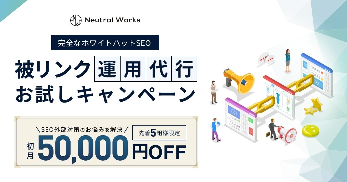 株式会社ニュートラルワークス(神奈川県茅ヶ崎市、代表取締役:三木五月/以下、ニュートラルワークス)では、2022年5月の提供開始から大好評を博している「被リンク運用代行サービス」のお試しキャンペーンを実施いたします。実績掲載にご協力いただける先着5組の企業様に、通常100,000円〜(税別)のサービスを50,000円OFF(税別)でご提供いたします。