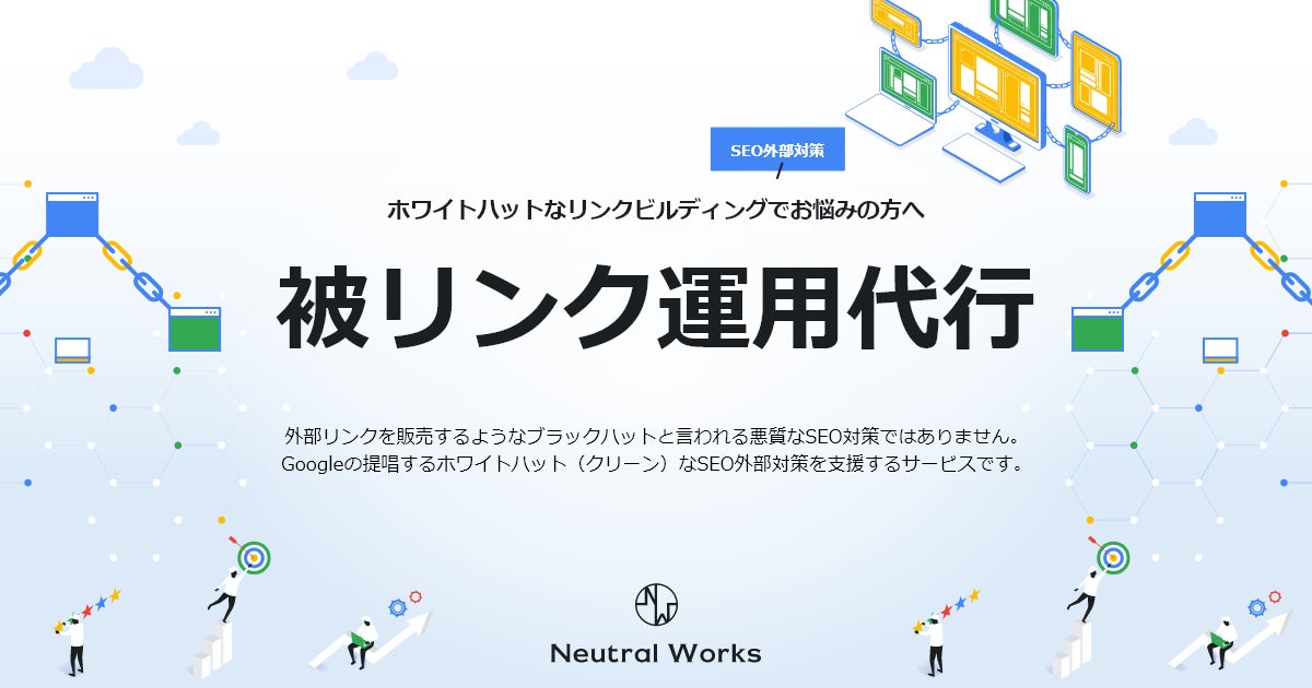 悪質で不適切なブラックハットSEOは、厳しいペナルティの対象となることも。ニュートラルワークスでは、Googleの提唱する本質的な被リンク獲得を代行します。