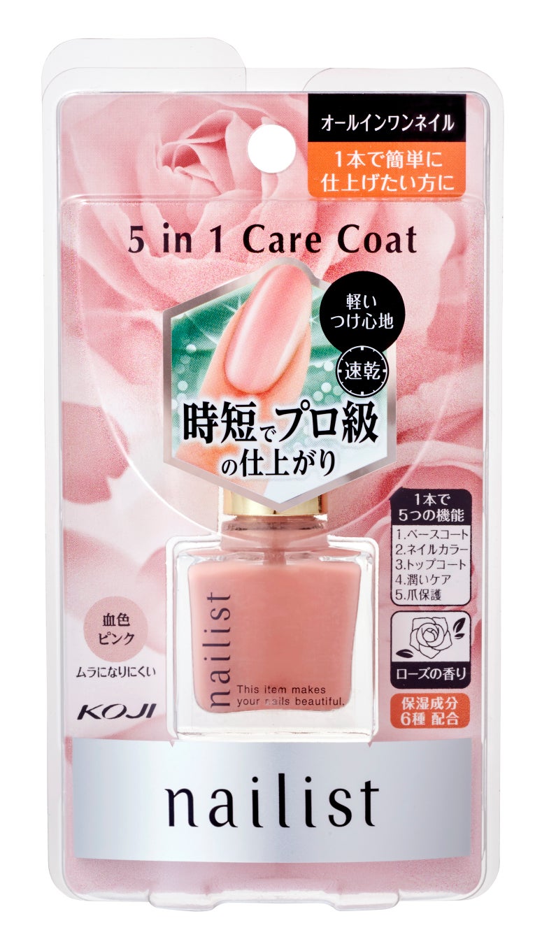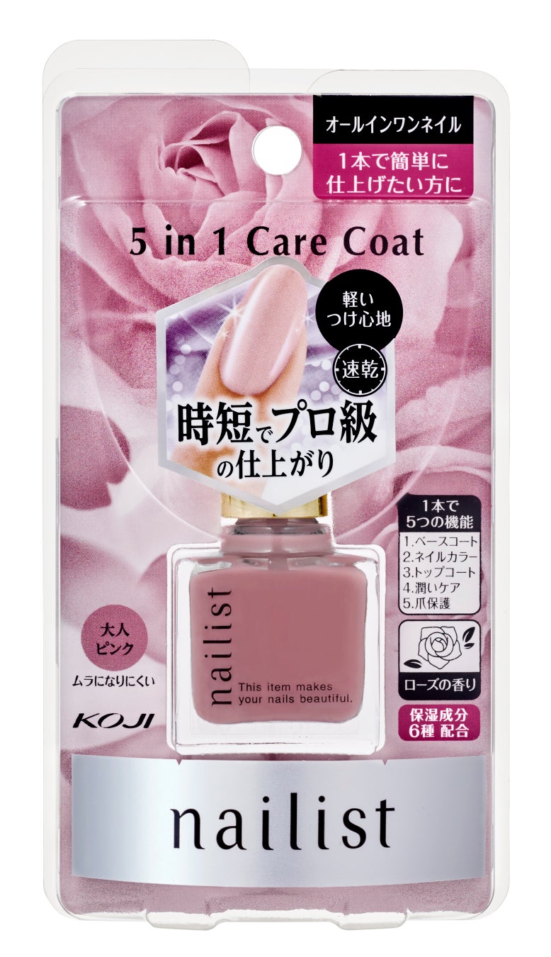 「ファイブインワンケアコート」は、 1本でベースコート・ネイルカラー・トップコート・潤いケア(保湿)・爪の保護ができるオールインワンネイルです。2021年の発売以来、時間をかけずにネイルを楽しみたい方にご好評をいただいています。今回、既存色でイエローベースの肌色向けカラー「ピンクベージュ」に加え、新色として、ブルーベースの肌色向けカラー「ローズピンク」が登場。透明感がアップする、上品な青みピンクです。
