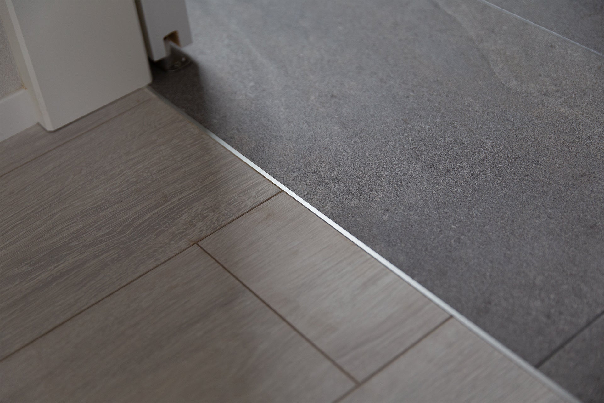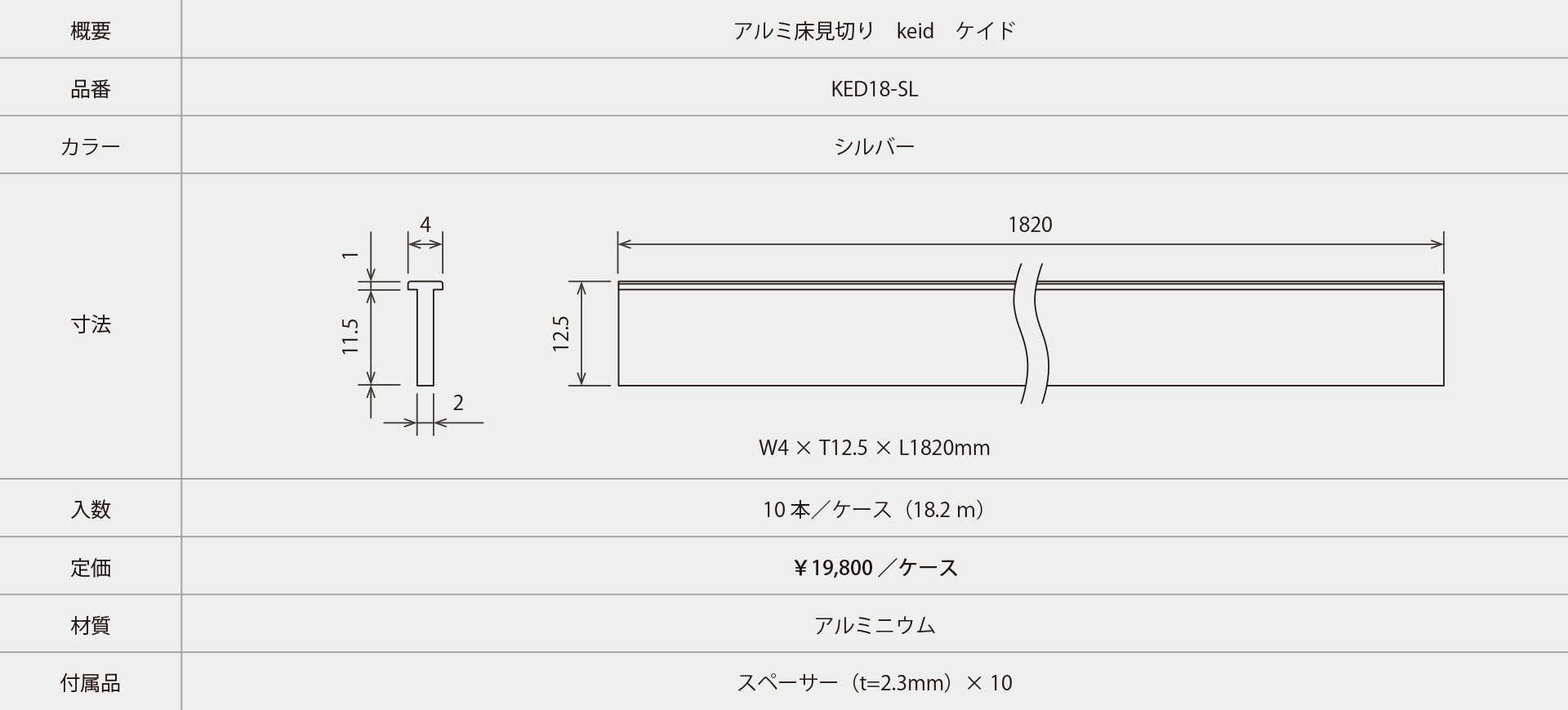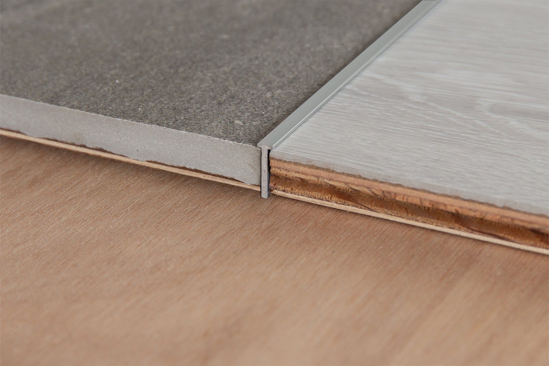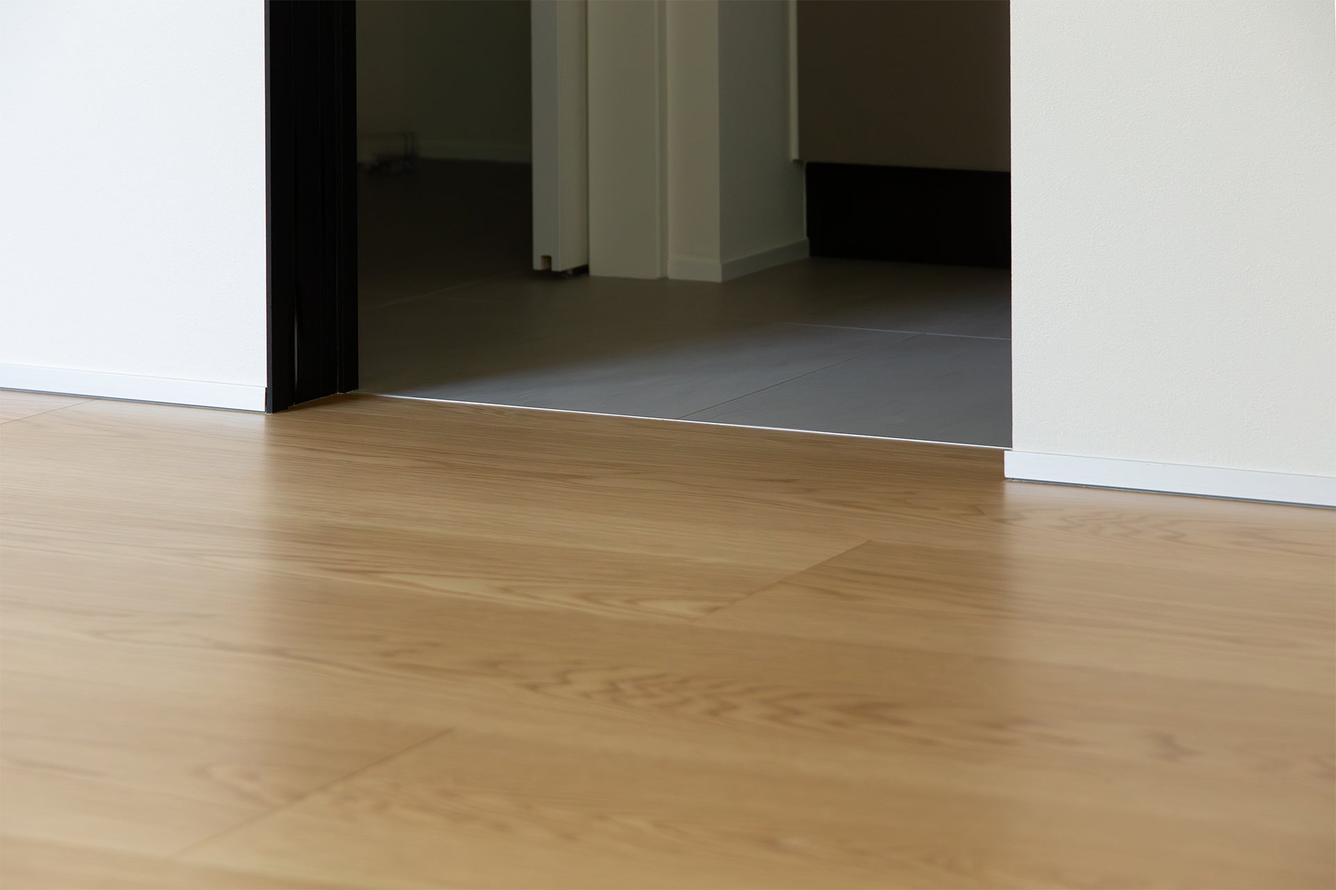 アルミニウムにアルマイト加工のマットシルバーを施した美しい質感で、カラーや素材を選ばず様々な床材に調和してくれます。住む人のためにも、取り付ける人のためにもデザインされた、シンプルながらも新しい床見切りです。