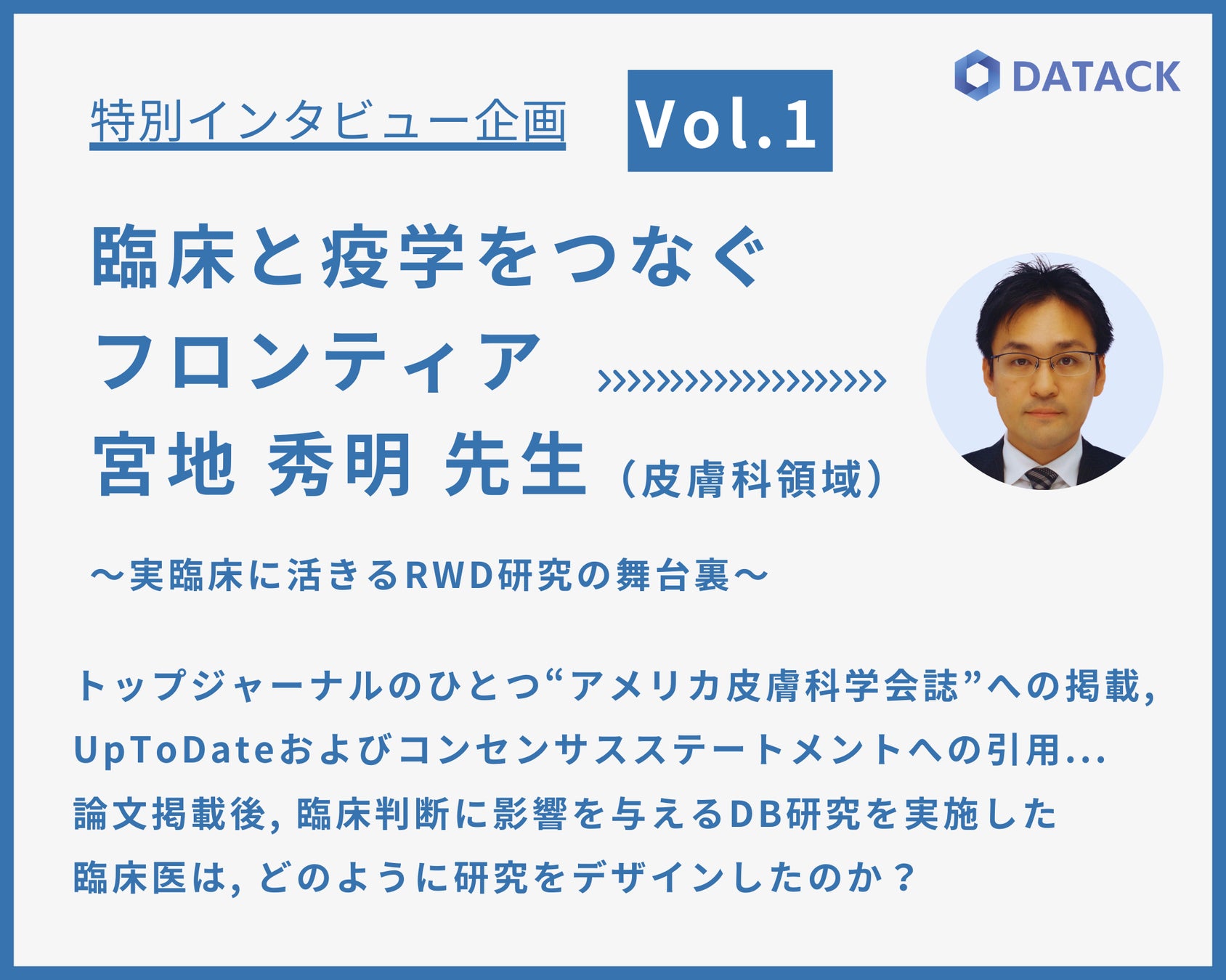 株式会社データック(東京都千代田区、代表取締役/医師:二宮英樹、以下:データック)は、リアルワールドデータ(RWD)に関する情報提供メディア「RWD Navi」にて、新企画「臨床と疫学をつなぐフロンティア 〜実臨床に活きるRWD研究の舞台裏〜」をスタートしました。