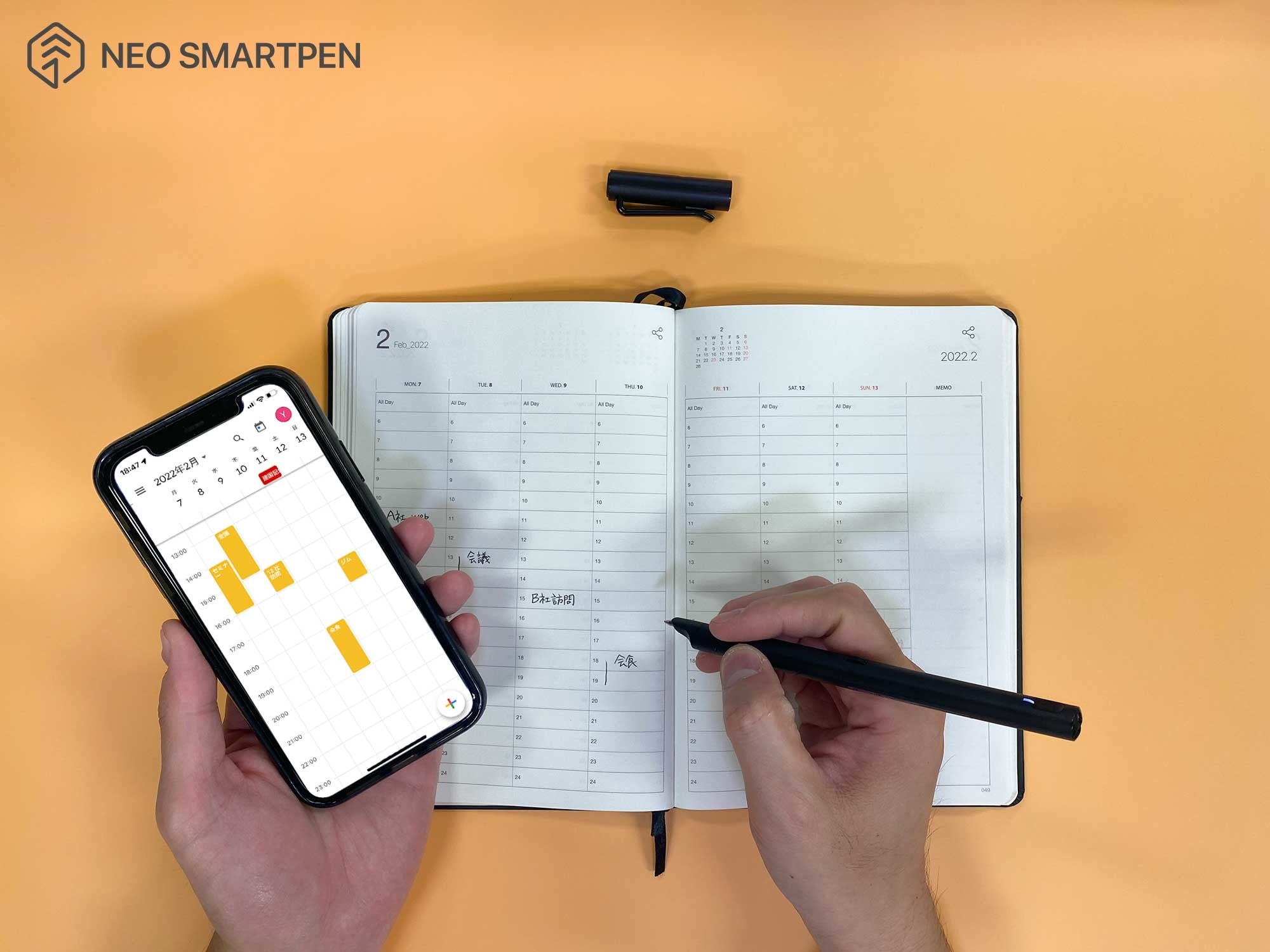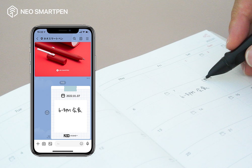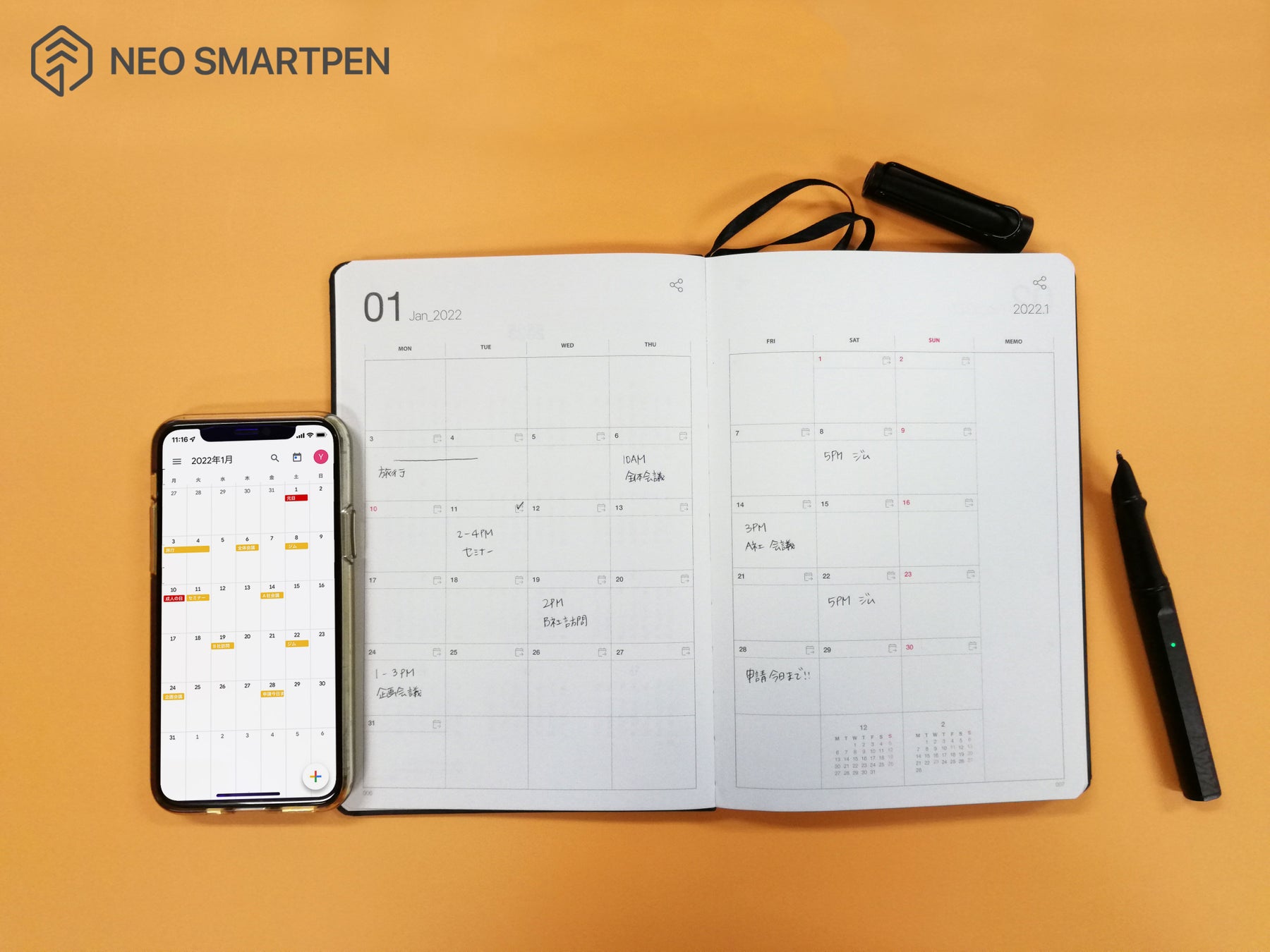 1. Neo smartpenで紙の手帳に予定を記入するとGoogle、Apple、Outlookカレンダーなど各種カレンダーアプリに連動します! その日の枠に書くとDigiカレンダーにも入ります!