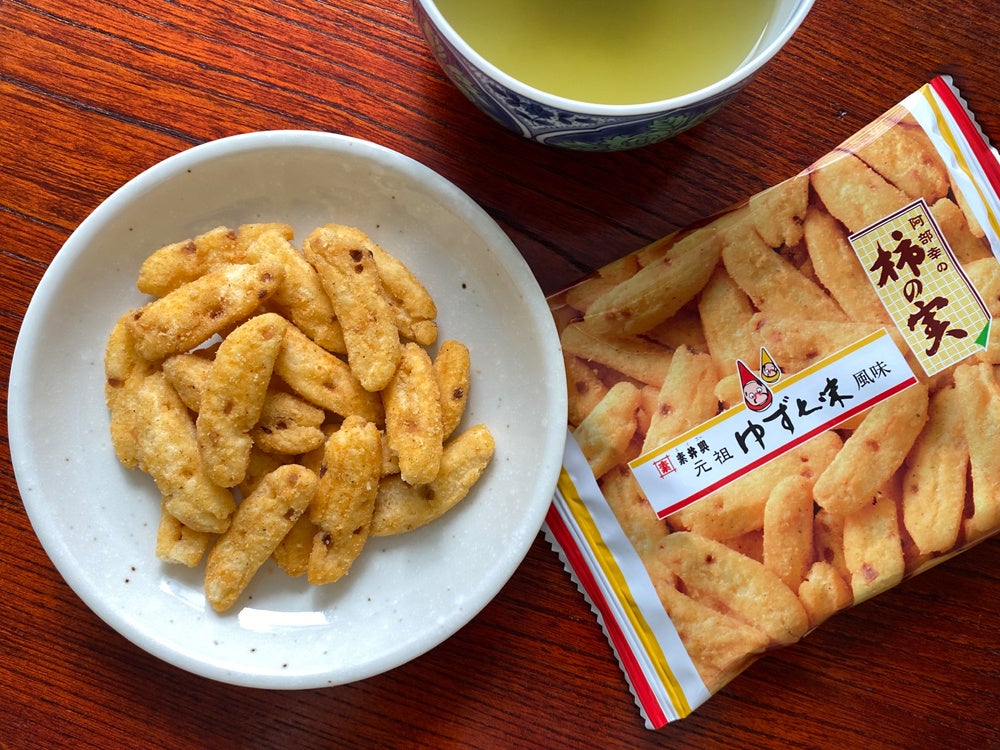 このように料理に刺激が求められる中、お菓子でも辛いものを楽しめるようにと企画しましたのが、「柿の実元祖ゆず七味風味」です。