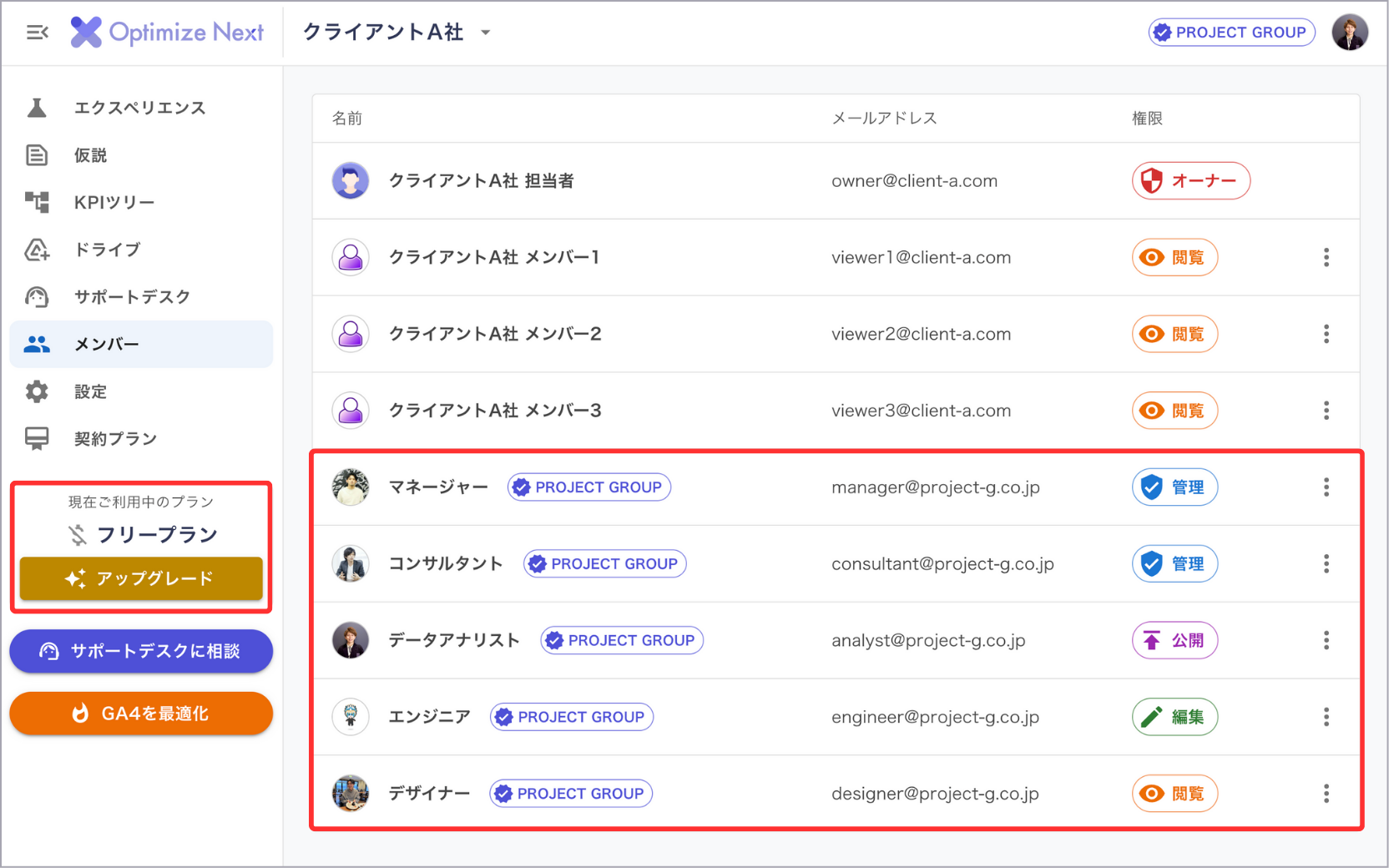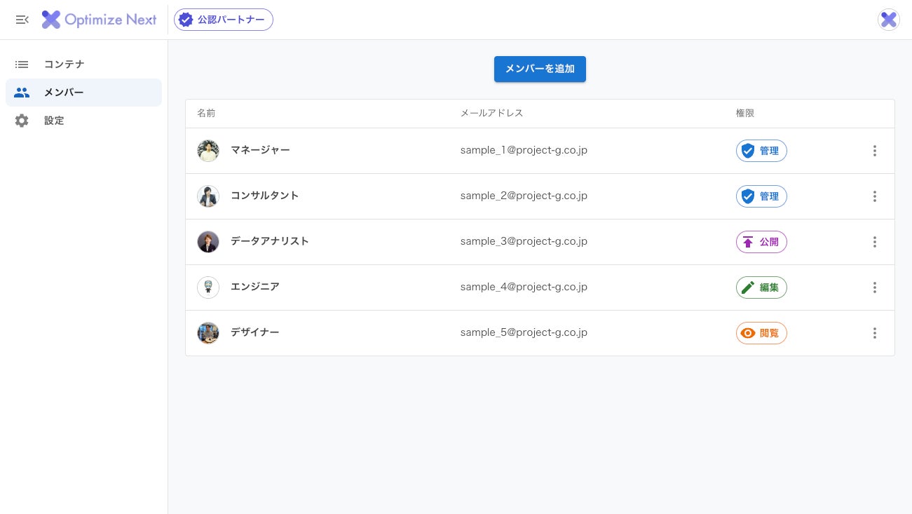 「公認パートナー」のチームメンバーとして登録されたアカウントは、クライアントのコンテナにおいて、Optimize Nextの全機能(プレミアムプラン相当の機能を含む)をご利用いただけます。