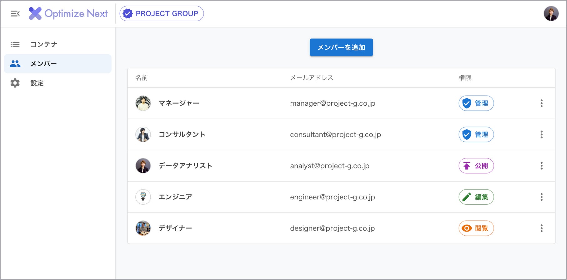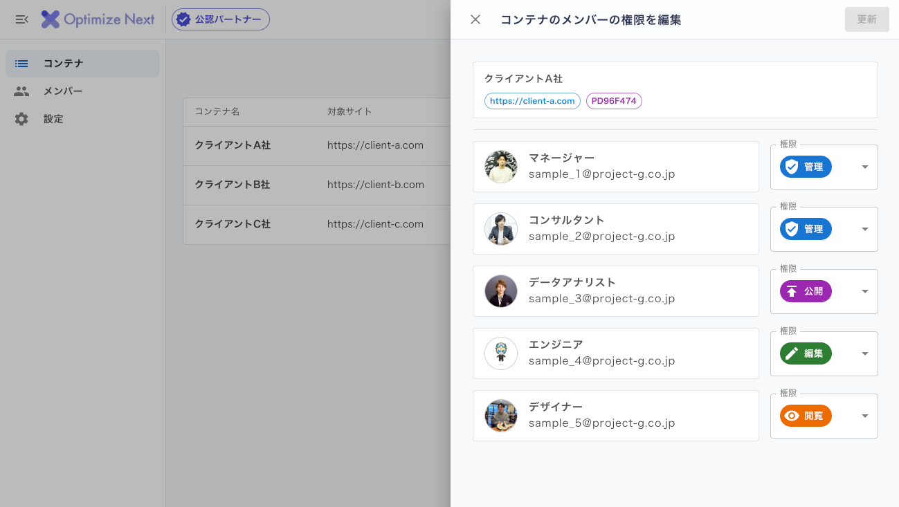登録されたクライアントのコンテナごとに、自社メンバーの権限を設定することも可能です。