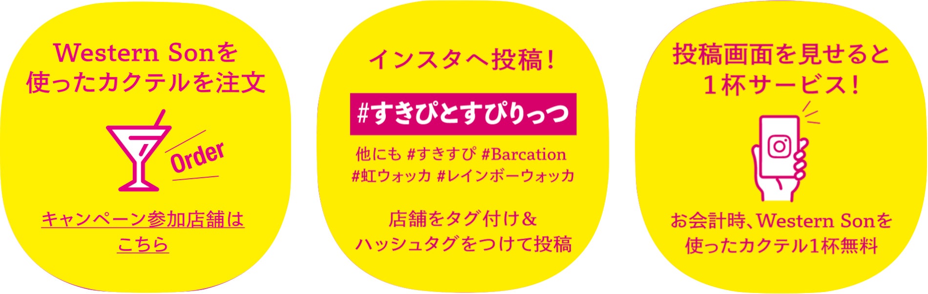 【内容】期間中、協賛店舗でWestern Sonを使ったカクテルをご注文し、店舗とキャンペーンハッシュタグを付けてInstagramに投稿してください。お会計時、投稿画面をご提示いただくことで、投稿していただいた商品を1杯無料とさせていただきます。