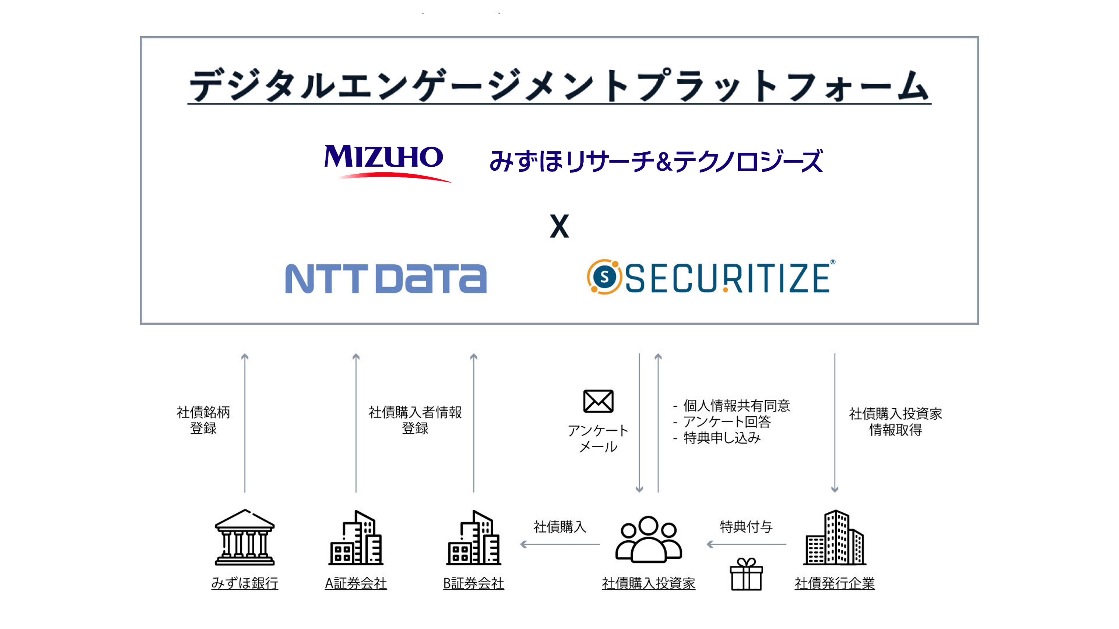 セキュリティ・トークン(以下、ST)/デジタル証券の発行・ライフサイクル管理プラットフォームを提供するSecuritize Japan株式会社(本社:東京都中央区、代表取締役:ジェームス・エイチ・フィン、以下、Securitize)は、みずほリサーチ&テクノロジーズ株式会社(以下、MHRT)および株式会社NTTデータ(以下、NTTデータ)との協業により、株式会社みずほ銀行(以下、みずほ銀行)向けに、ブロックチェーン技術を活用し、発行体が投資家と直接接点を持つことを可能にするシステム基盤「デジタルエンゲージメントプラットフォーム」(以下、本プラットフォーム)を構築したことをお知らせします。みずほ銀行は、公社債などの金融商品の発行体に向けて本プラットフォームの提供を開始しました。この取り組みにより、発行体にとって、従来は難しかった、投資家に対する直接的なマーケティングの実施や、さまざまな特典やポイントの付与をタイムリーに行うことが可能となります。
