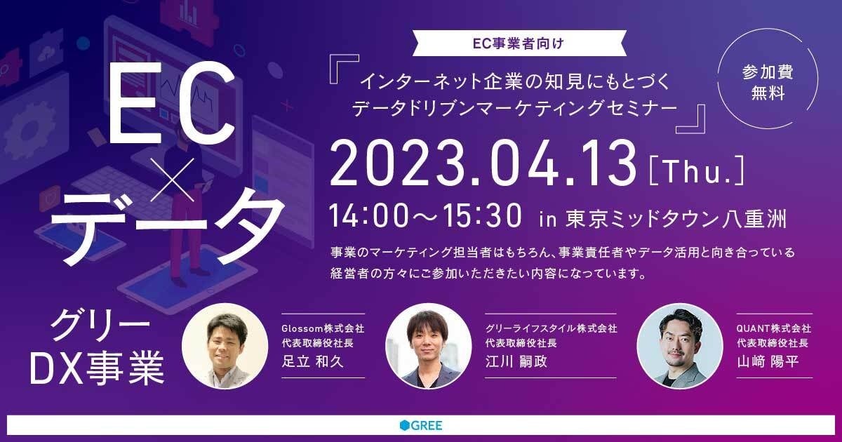 Glossom株式会社(本社:東京都新宿区、代表取締役社長:足立和久、グリー株式会社100%子会社、以下「Glossom」)は、EC事業者向けのインターネット企業の知見にもとづくデータドリブンマーケティングセミナーを開催し、グリーDX事業のグリーライフスタイル株式会社(本社:東京都新宿区、代表取締役社長:江川 嗣政、グリー株式会社100%子会社、以下「グリーライフスタイル」)、QUANT株式会社(本社:東京都新宿区、代表取締役社長:山﨑 陽平 グリー株式会社100%子会社、以下「QUANT」)と共に登壇します。