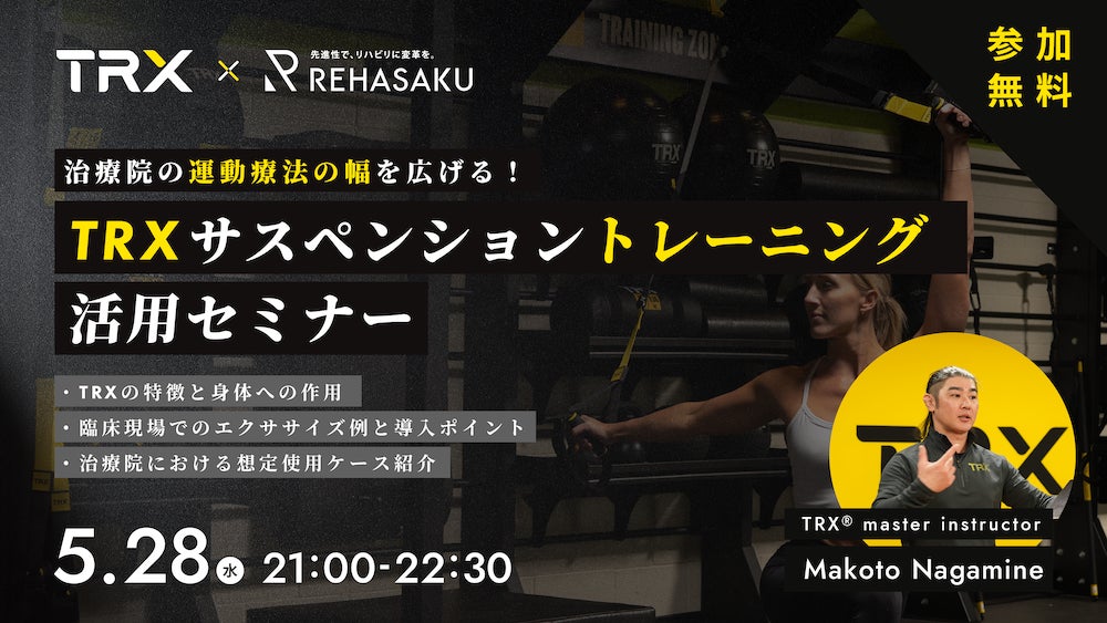 まずは初回として5月28日(水)、『運動療法の幅を広げる!TRXサスペンショントレーニング活用セミナー』をオンラインにて開催いたします。
