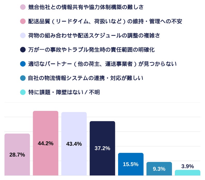 次いで「荷物の組み合わせや配送スケジュールの調整の複雑さ」が43.4%。オペレーションの煩雑さが導入をためらわせる大きな要因となっている。