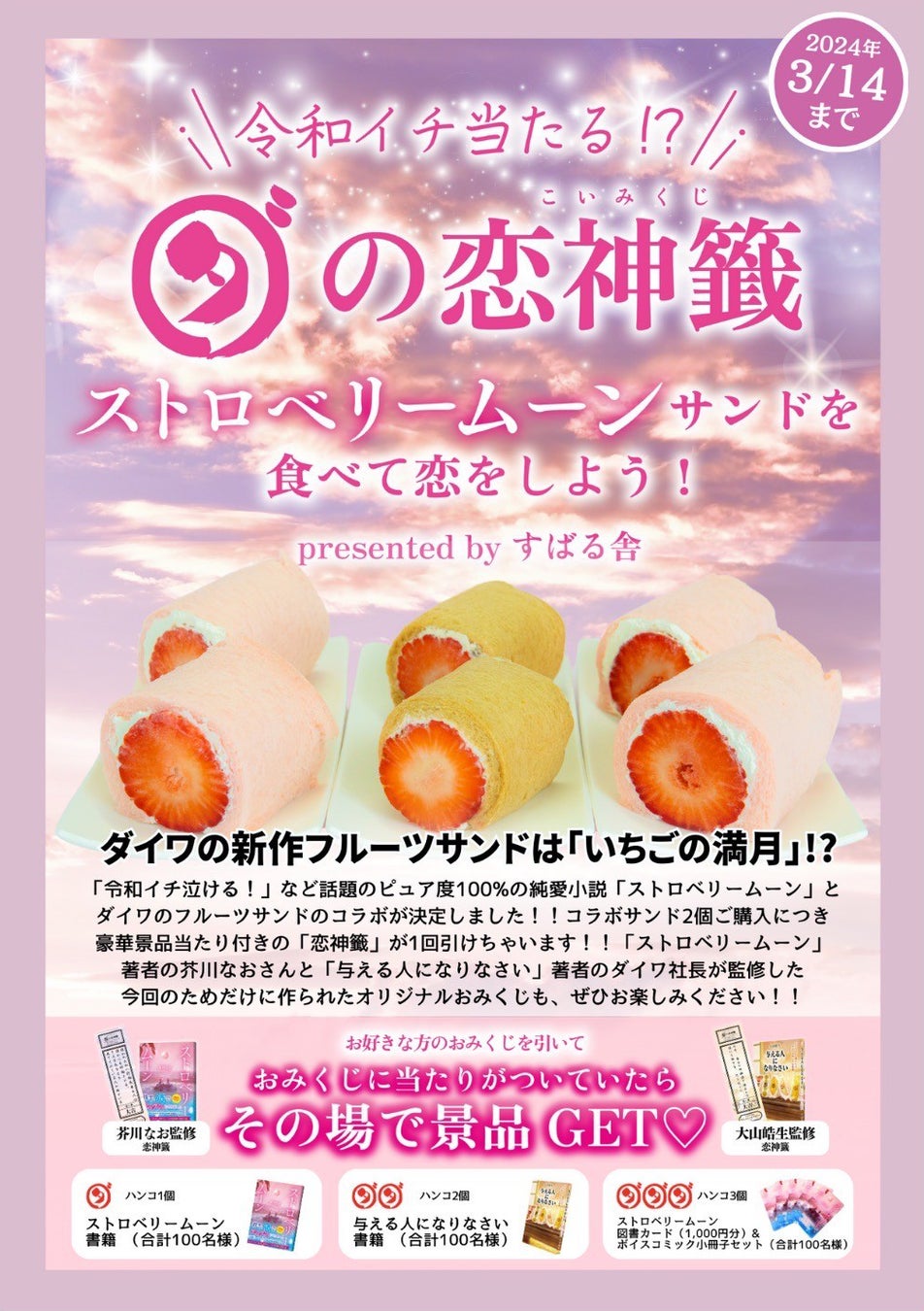 ストロベリームーンサンド2種類のうち、いずれかを2個以上購入で恋神籤(芥川なお監修ver、ダイワ・大山皓生監修『与える人になりなさい』ver)を1回抽選。恋神籤の中に当たりシールがあれば、その場で商品をプレゼント! 限定300名様。