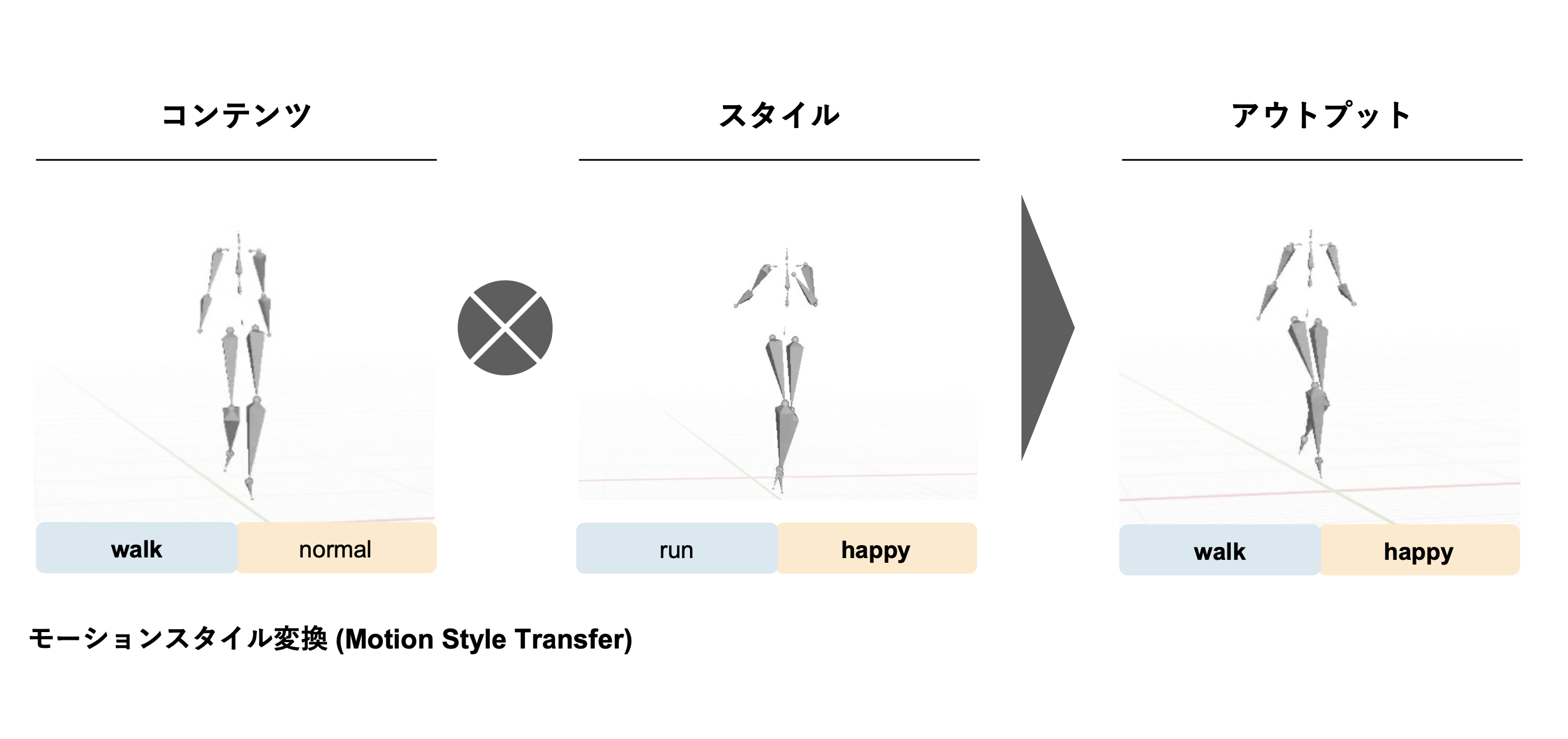 多彩なキャラクターモーションを生成するためには、AI技術である「モーションスタイル変換」を用います。「モーションスタイル変換」とは、モーションを動作の内容を表す「コンテンツ」(例:歩く)と動作のニュアンスを表す「スタイル」(例:楽しそうに)に分解し、2つのモーションをかけ合わせた時に、一方のモーションの「コンテンツ」を維持し、もう一方のモーションの「スタイル」を反映した新しいモーション(例:楽しそうに歩く)を作成する技術のことを指します。