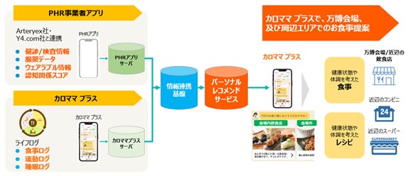 大阪・関西万博へのご来場前に、「カロママ プラス」に食事や運動、睡眠、気分などライフログを数日間入力し、「パシャっとカルテ」「Vital Gain」に登録した健診・服薬およびウェアラブル情報などのデータを連携することで本体験を実現します。