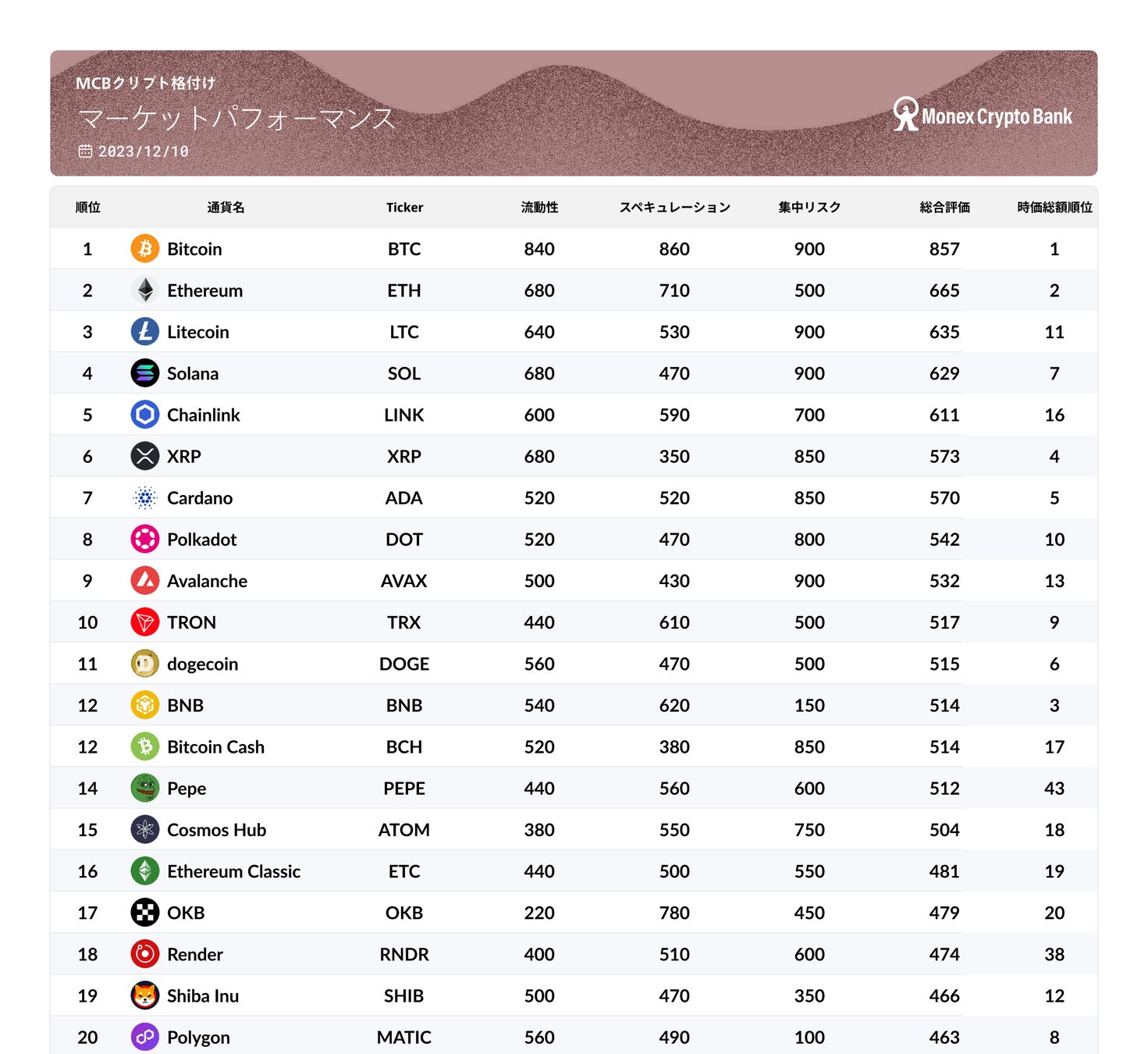 BTC、ETHは依然ダントツでトップ2を占める結果となったが、前回8位だったLTC、5位だったSOLがそれぞれ3位、4位と得点をあげた。今回新しく格付け対象となったオラクルプロジェクトのLINKは5位につけている。これら3銘柄は高い流動性に加えて集中リスクの観点で評価が高いことが、このような結果となった理由として挙げられる。