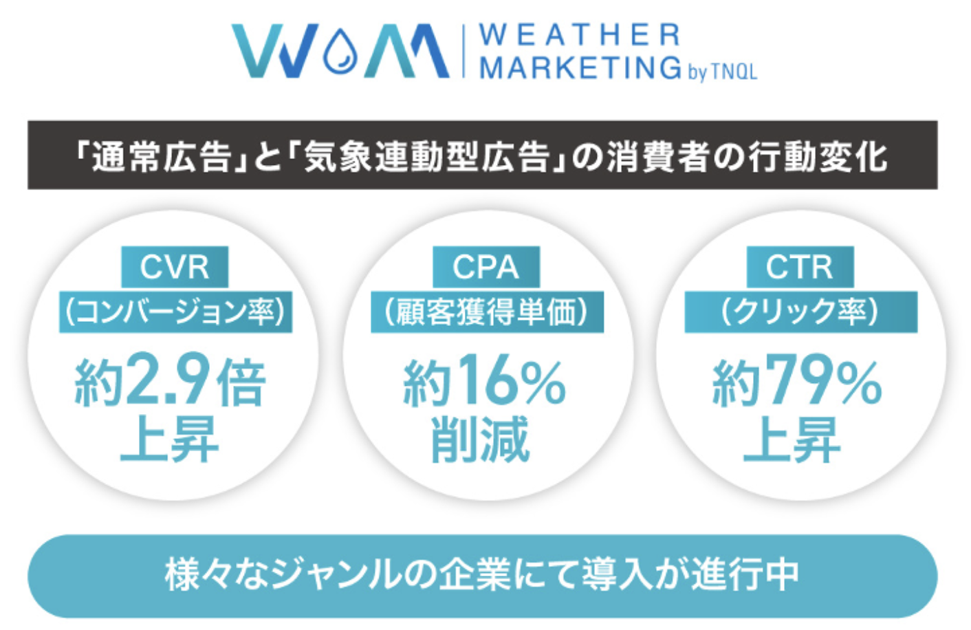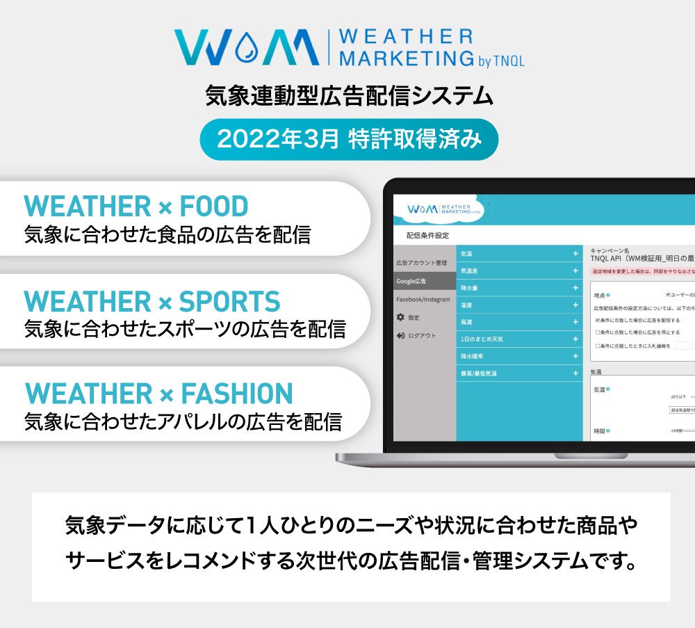 「weathermarketing.net」は、ルグランの20年に及ぶ運用型広告の管理・最適化の経験と、2017年のサービス提供開始以来、累計約25万人が利用している気象連動型コーディネート提案ツール「TNQL(テンキュール)」で培われた気象データ活用の知見の融合することで開発された、画期的な広告配信システムです。