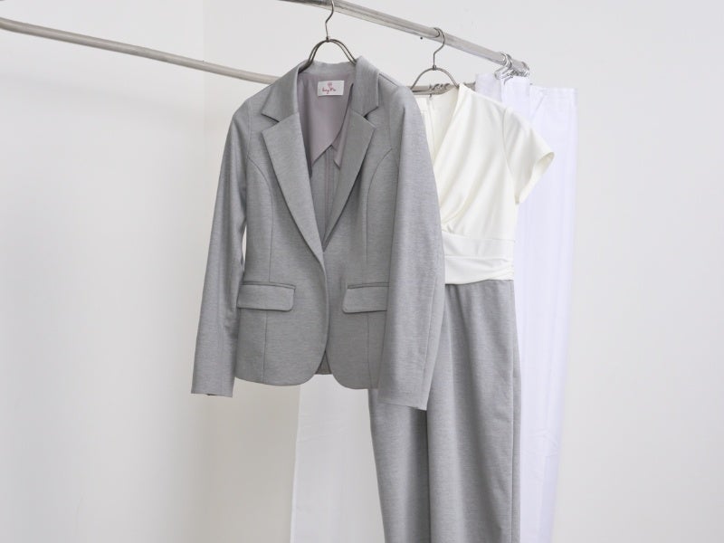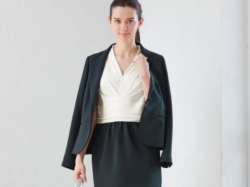 ジャケットと同素材のスカートをドッキングしたワンピースなど