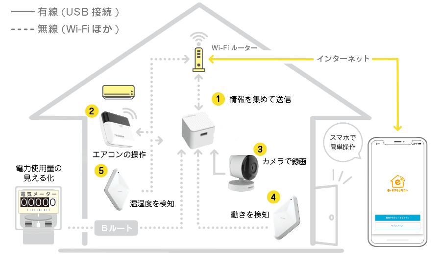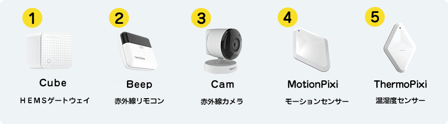 モバイルアプリ「e-おうちリモコン」、IoEゲートウェイ「Cube」、温湿度センサー「Thermo Pixi」、赤外線リモコン「Beep」、USBカメラ「CAM」をセットにしました。