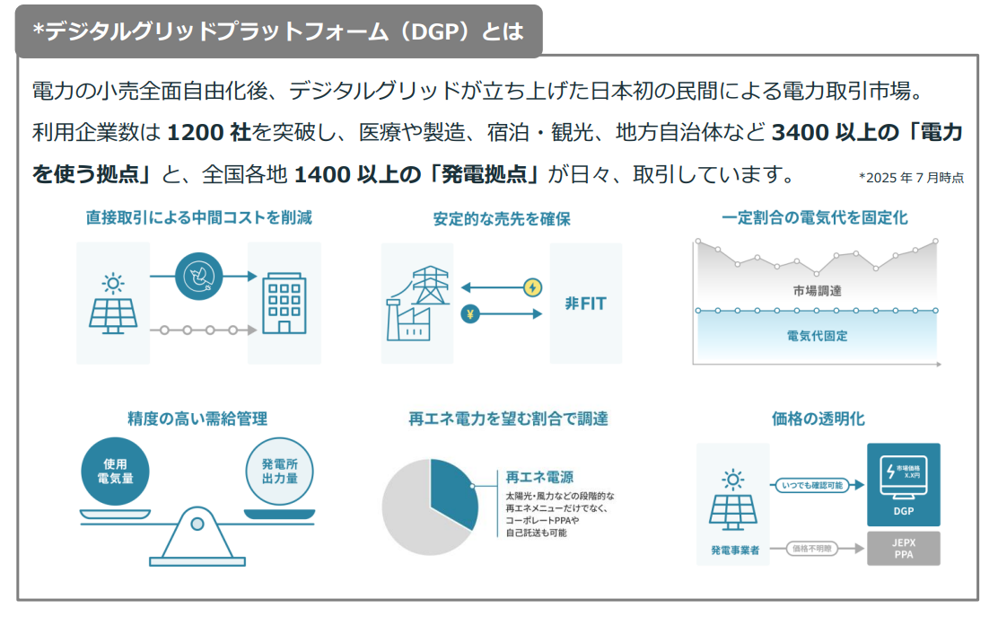 事業内容:電力及び環境価値取引プラットフォーム「DGP」運営、分散型電源アグリゲーションサービスの提供